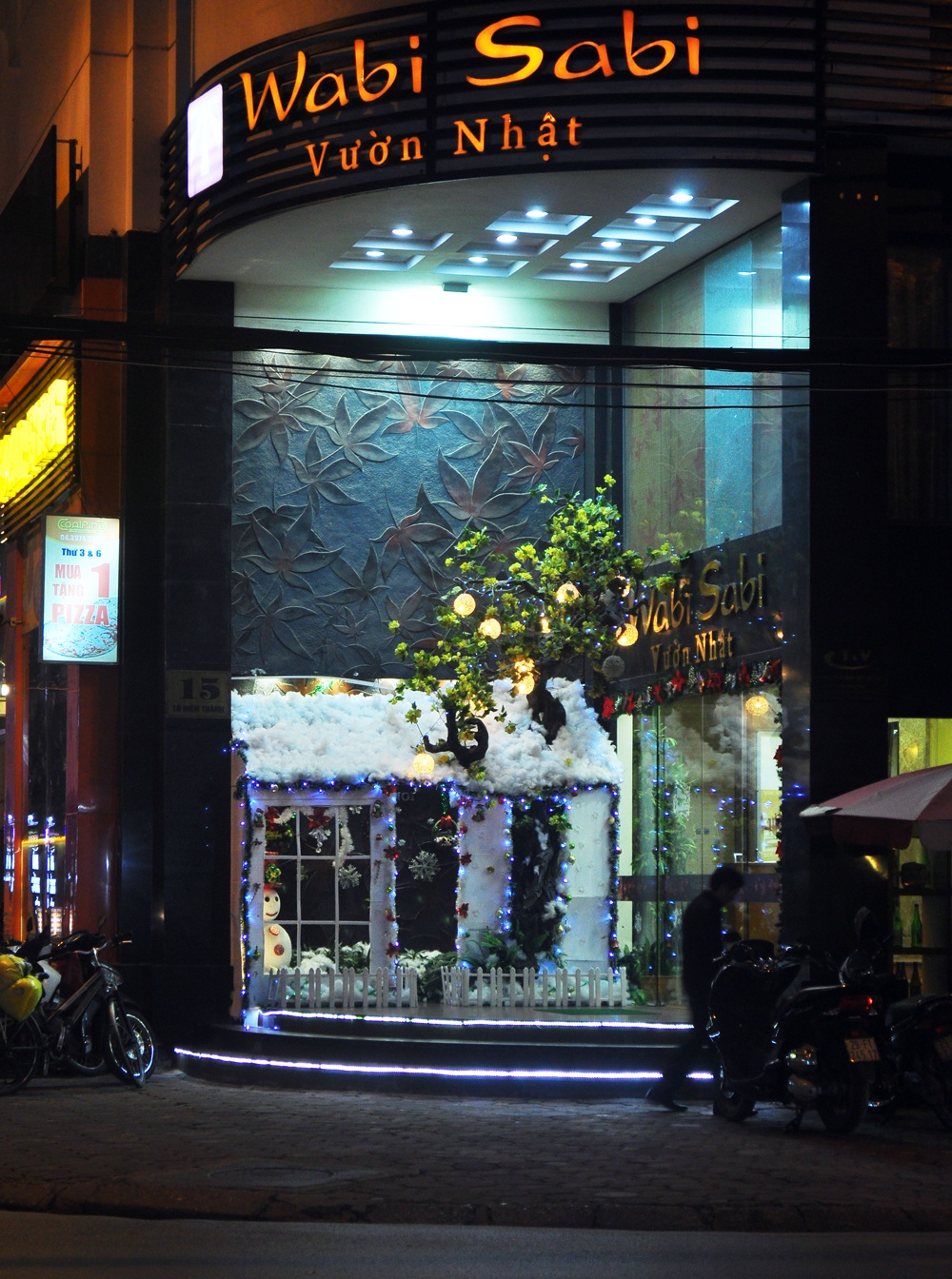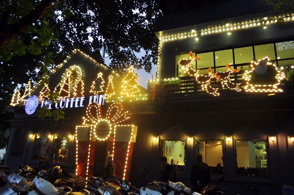| The Coffee Inn nổi bật với giàn đèn điện tạo hình cổng chào, cây thông và đoàn tuần lộc kéo xe ông già Noel. |