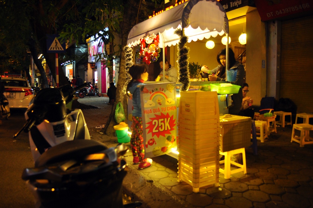 | Điều thú vị là không khí Giáng sinh còn đến cả những quán vỉa hè. Đây là một xe buffet hoa quả chỉ bán buổi chiều tối ở vỉa hè cuối phố Bà Triệu. |