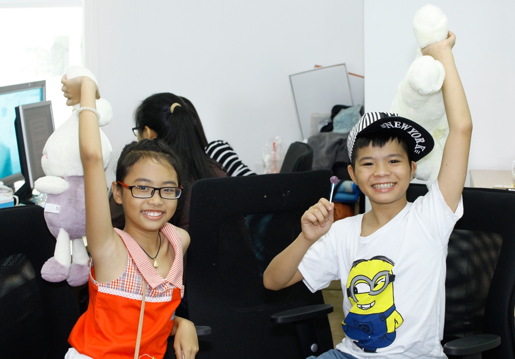 Hai thí sinh nhí cùng vui đùa bên nhau. |