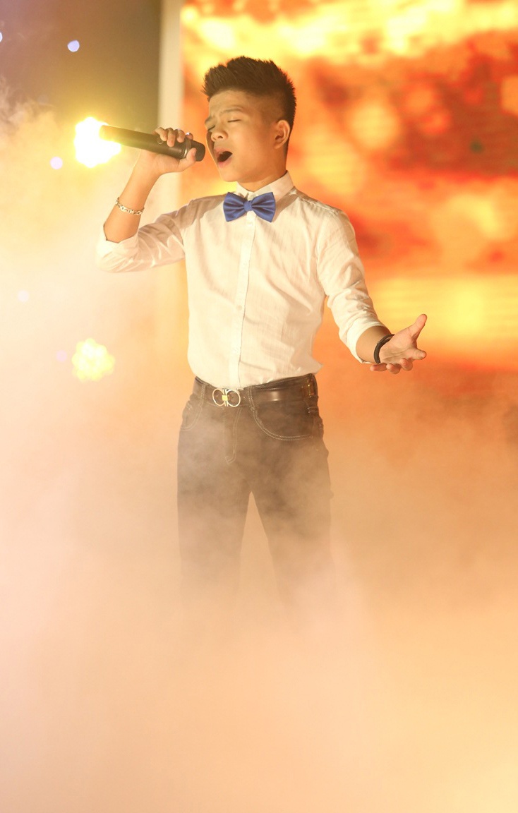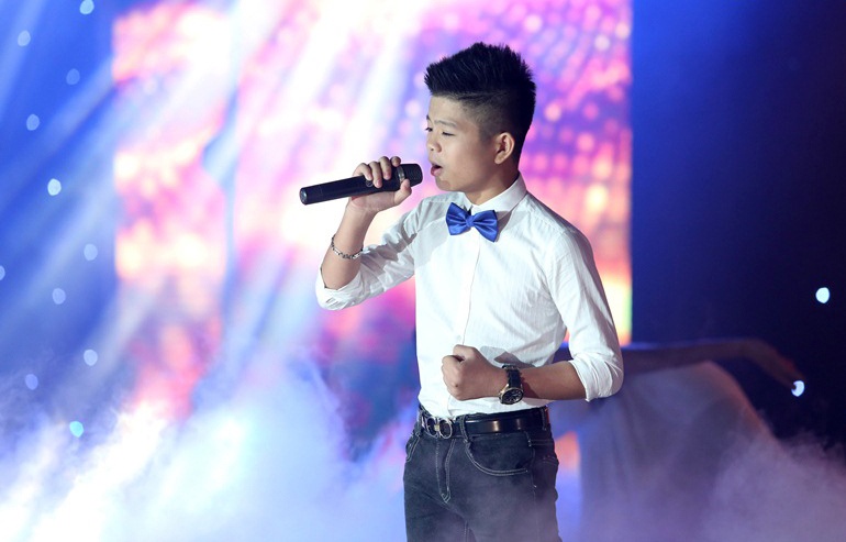 | Quán quân The Voice Kids 2013 tự tin phiêu với ca khúc quen thuộc. Màn biểu diễn của nam ca sĩ nhí nhận được nhiều tràng vỗ tay tán thưởng của khách mời. |