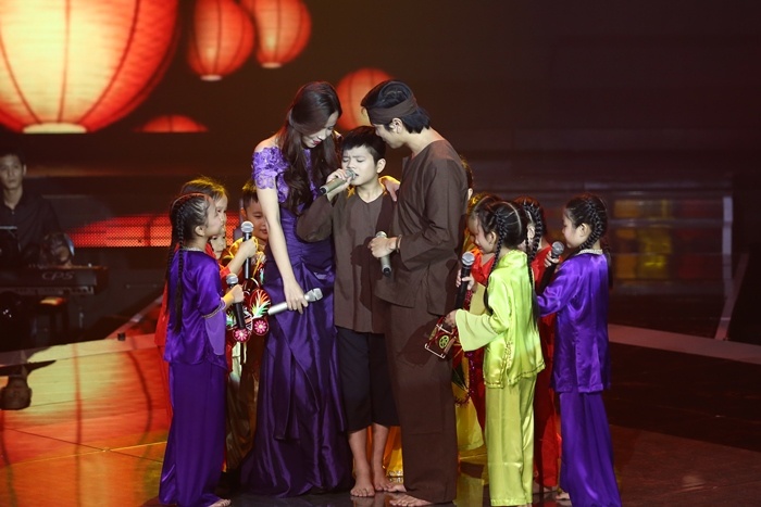 | Cậu nhóc tiếp tục khoe giọng hát trong nhưng cao và đầy nội lực khi hát Quê nhà cùng hai HL. |