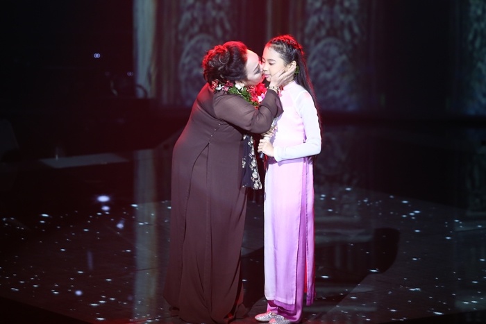 | Hai cô trò Hiền Thục và Phương Mỹ Chi đã ôm chầm lấy nhau sau khi cùng hòa giọng ở liên khúc dài tới 3 bài. |