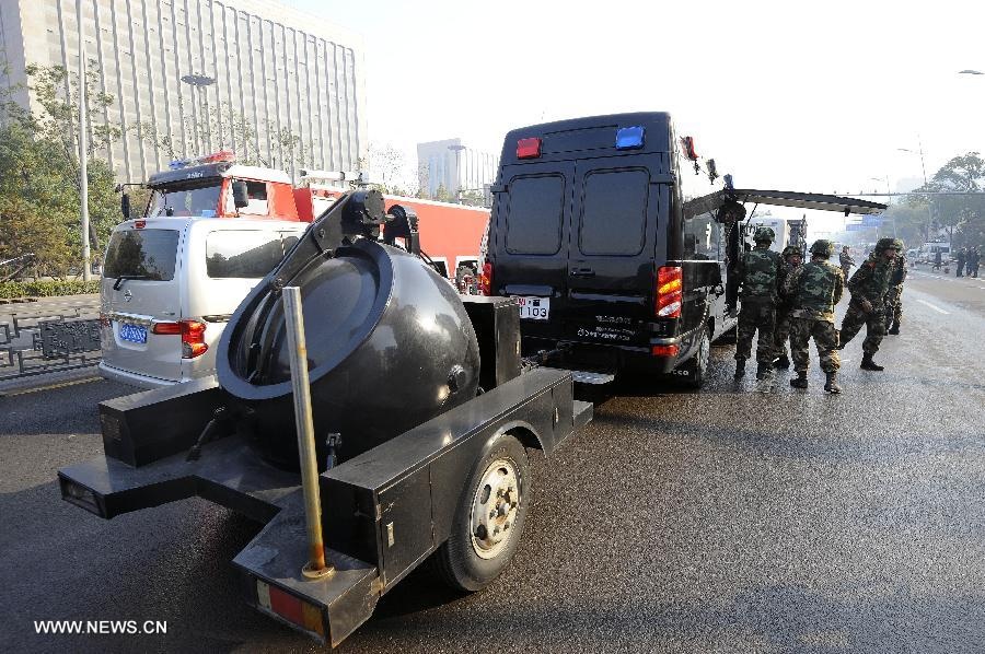 | Phương tiện gỡ bom của cảnh sát sẵn sàng làm việc. Ảnh: Tân Hoa Xã. |