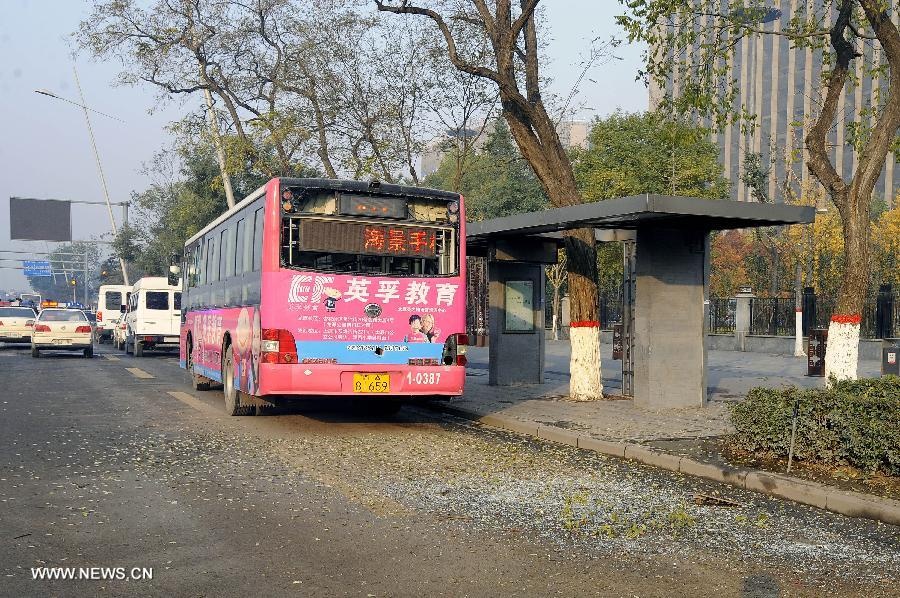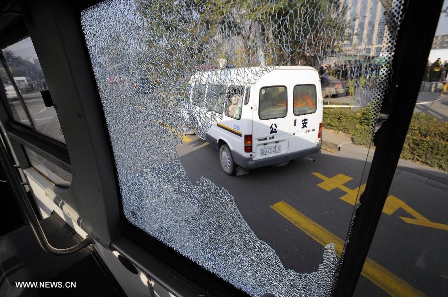 | Cửa kính của một chiếc xe bus vỡ vụn. Ảnh: Tân Hoa Xã. |