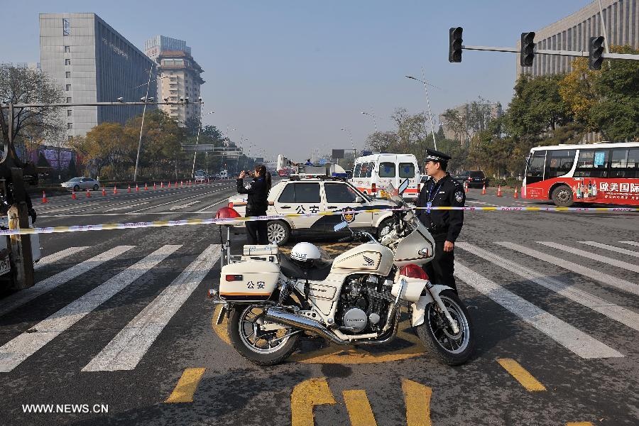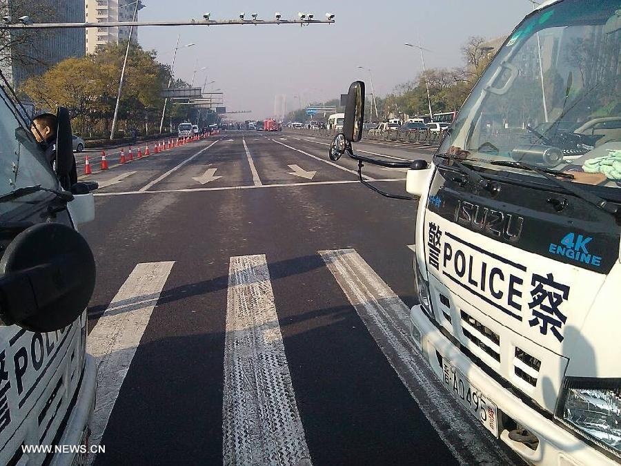 | Xe cảnh sát chặn một tuyến đường dẫn đến hiện trường. Ảnh: Tân Hoa Xã. |