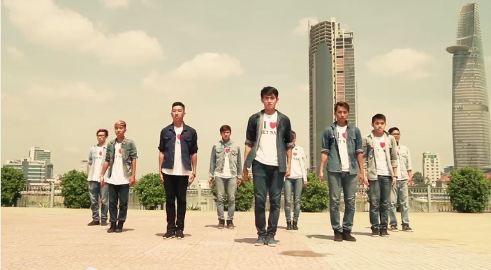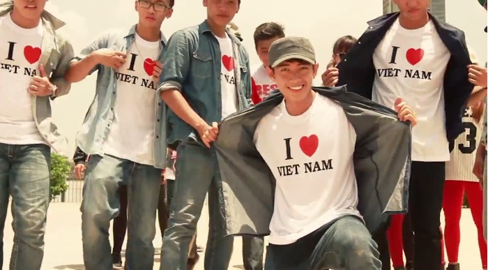 Quang Đăng cùng những bạn của mình mặc áo có dòng chữ I love Viet Nam như một thông điệp đến mọi người trong những ngày tình hình Biển Đông căng thẳng.