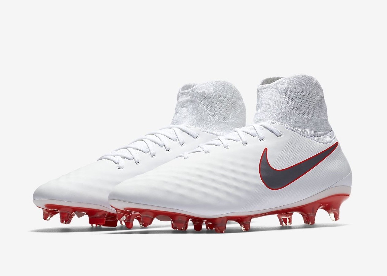 Nike Magista Opus II là một trong những đôi giày bán chạy nhất trong dòng giày đá bóng của Nike bởi các phối màu nổi bật và chất lượng hoàn hảo, mặc dù giá thành không rẻ. Phần đế giày ngoài những gai nhựa cố định còn có thêm cả phần gai bổ sung nhằm tăng lực dồn cho những cú sút. Ảnh: Nike.
