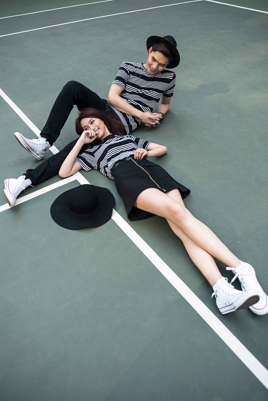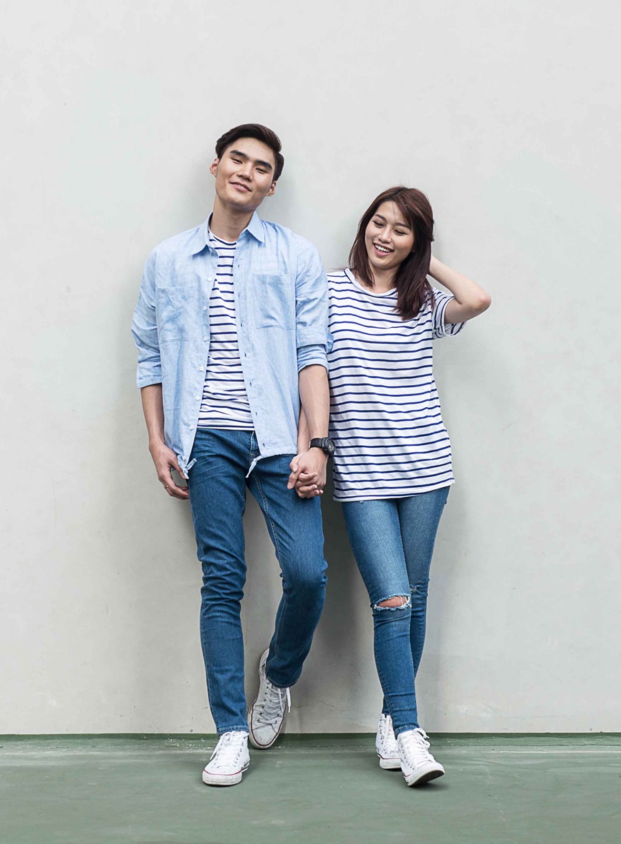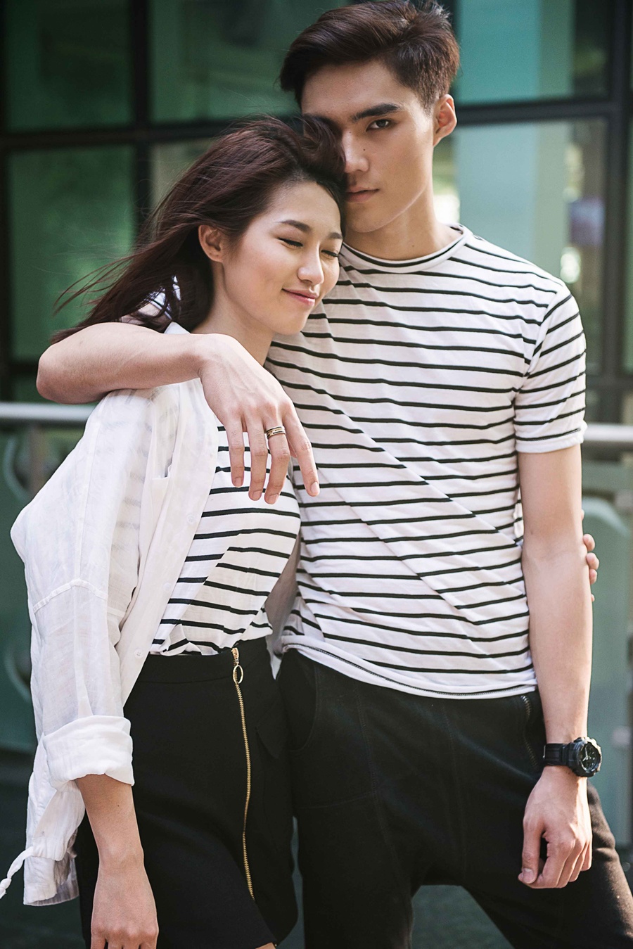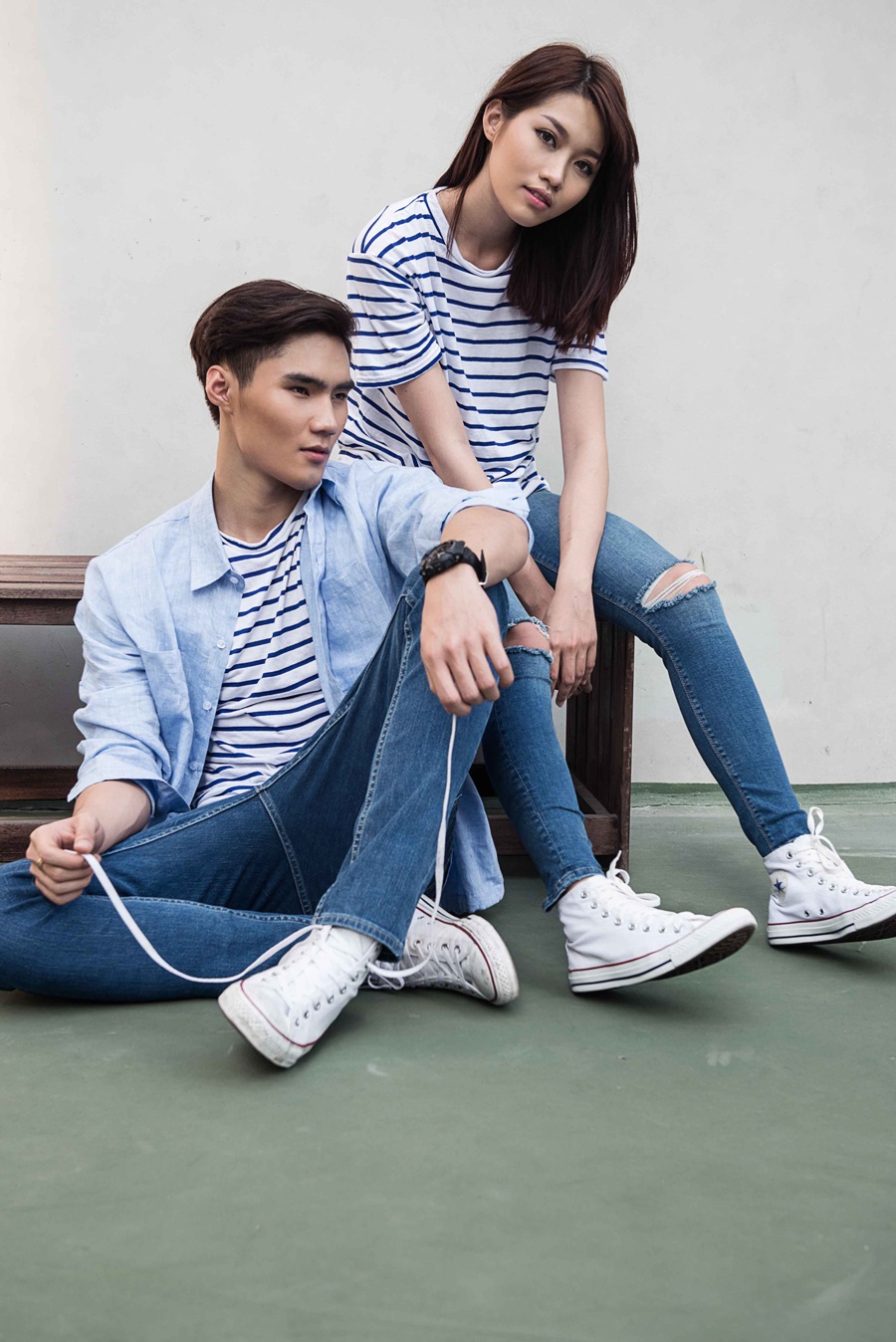 | Trong bộ ảnh mới, đôi tình nhân thể hiện hình ảnh đời thường, hiện đại, năng động. Trang phục chủ đạo gồm jeans, thun, sọc kẻ... |