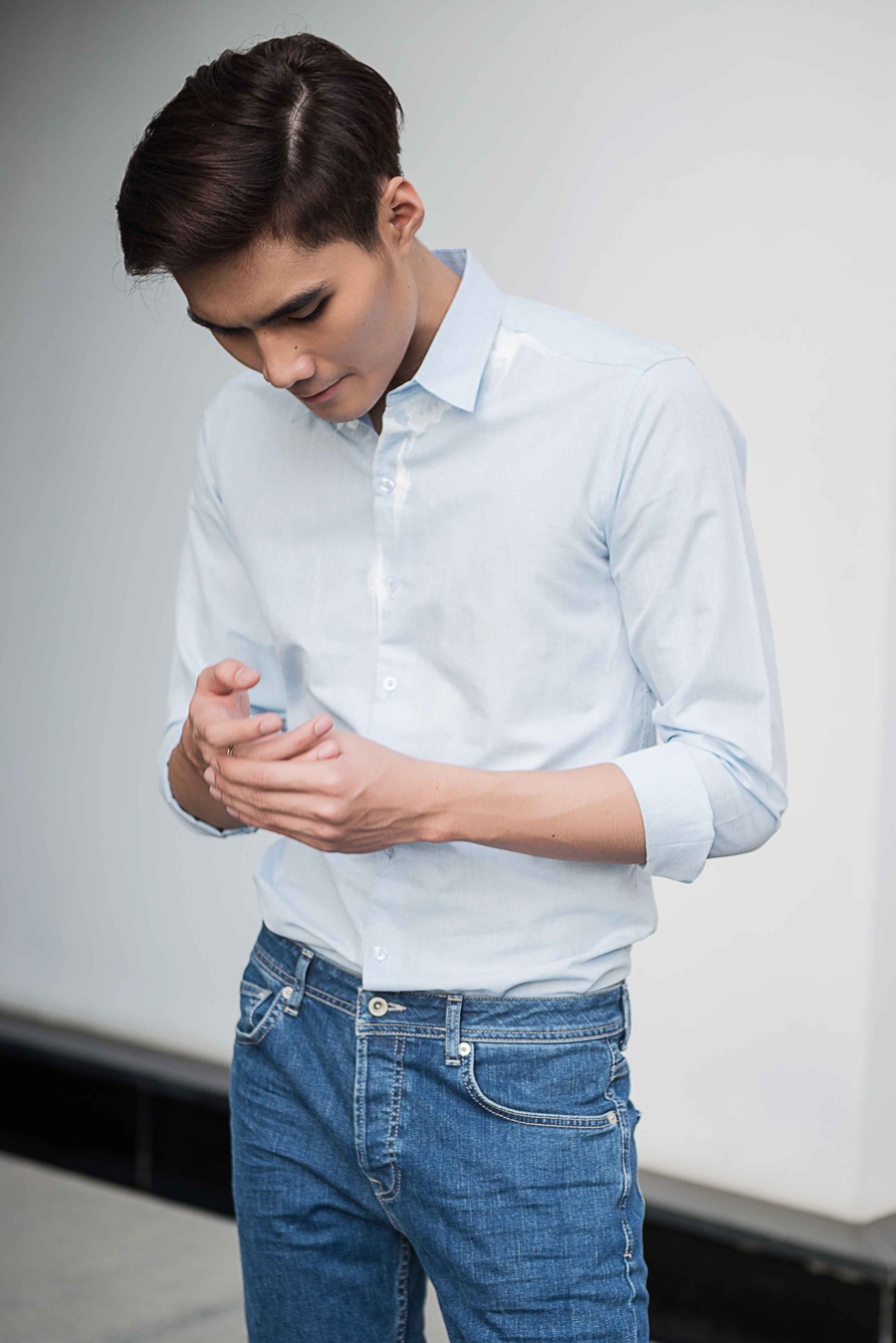 | Bộ cánh có áo sơ-mi gam màu xanh pastel nhã nhặn, mix ăn ý cùng quần jeans đậm màu. |