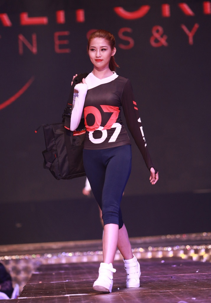 | Quán quân Nguyễn Oanh cũng tham gia diễn thời trang. Cô sải bước cùng người mẫu Tây - vốn là huấn luyện viên cá nhân của một trung tâm thể dục thể hình. |