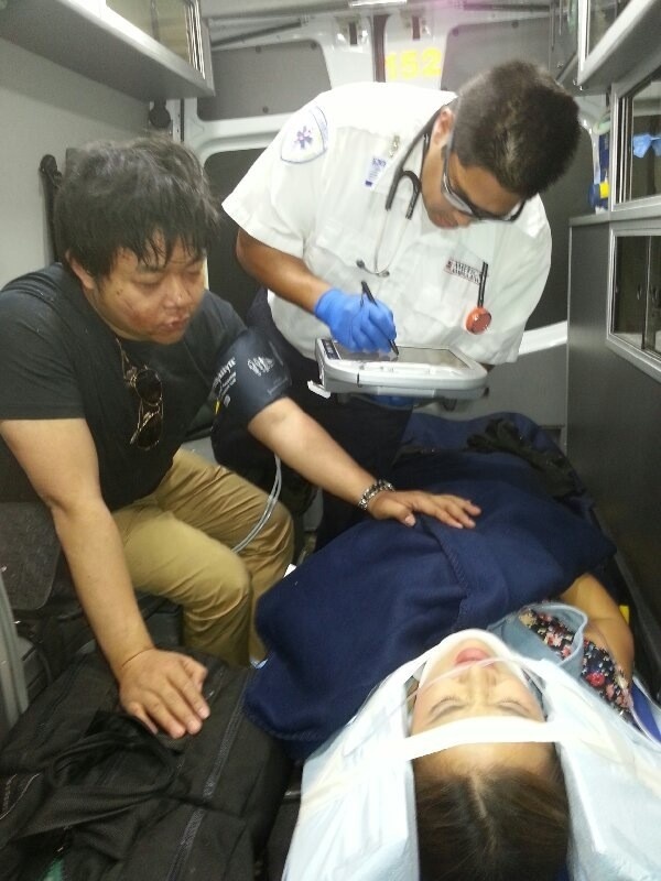 | Gương mặt thất thần của Quang Lê bên cạnh Lam Anh trên xe cấp cứu. |