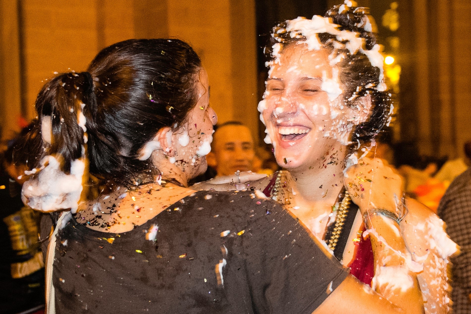 | Các vị khách người nước ngoài cũng quậy tưng bừng với trò phun xà bông vào người trước cửa nhà thờ. Ảnh: Hải An. |