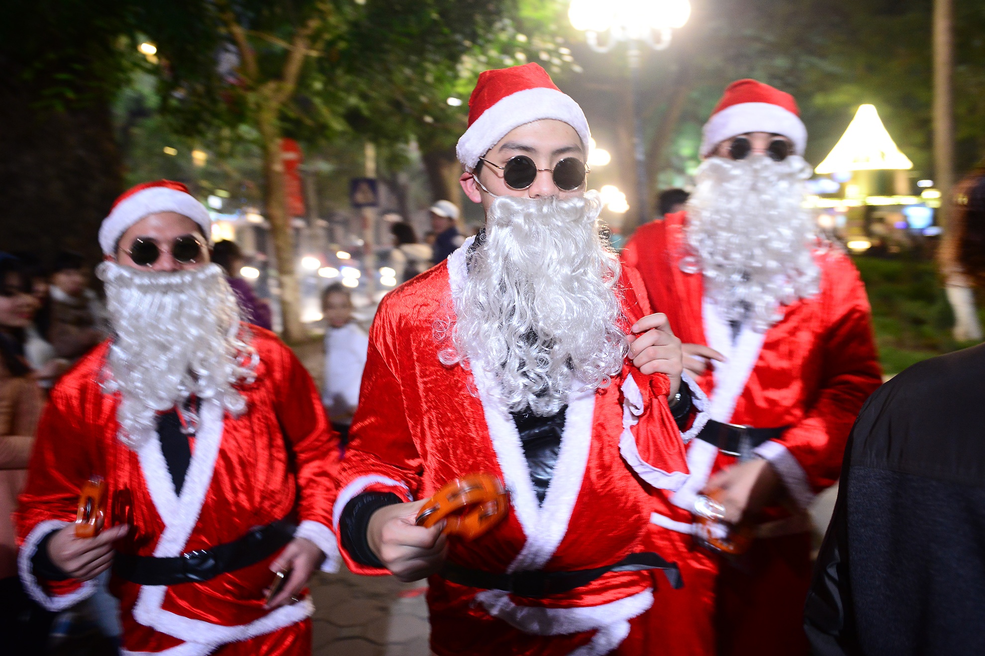 | Các chàng trai trẻ nghịch ngợm với cặp kính đen và bộ râu trắng dài kiểu ông già Noel đi dạo phố. Ảnh: Tuấn Mark. |