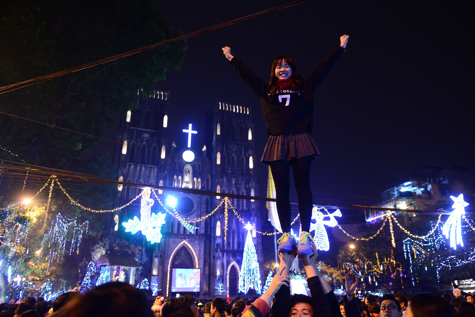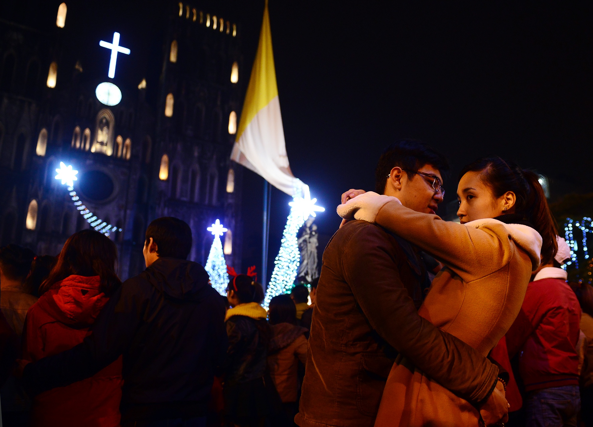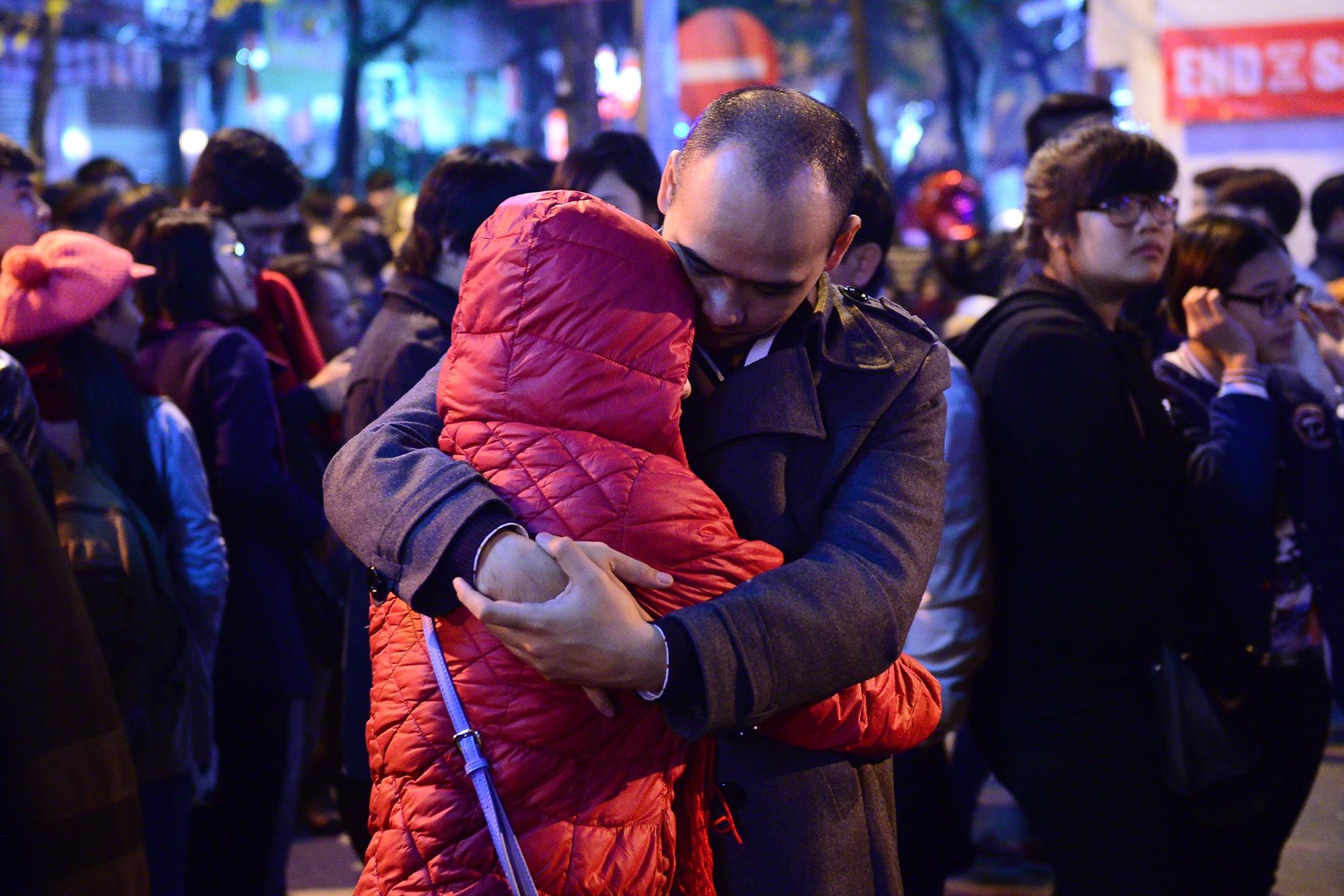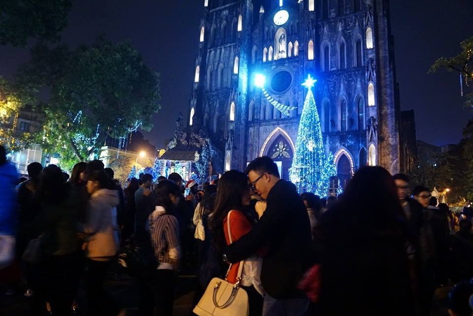 | Vào mỗi dịp lễ Giáng sinh hàng năm, trước cửa nhà thờ Lớn Hà Nội thường có rất nhiều đôi lứa đến cầu nguyện và hẹn thề, trao gửi tình cảm trước đám đông. Ảnh: Duy Hiếu. |