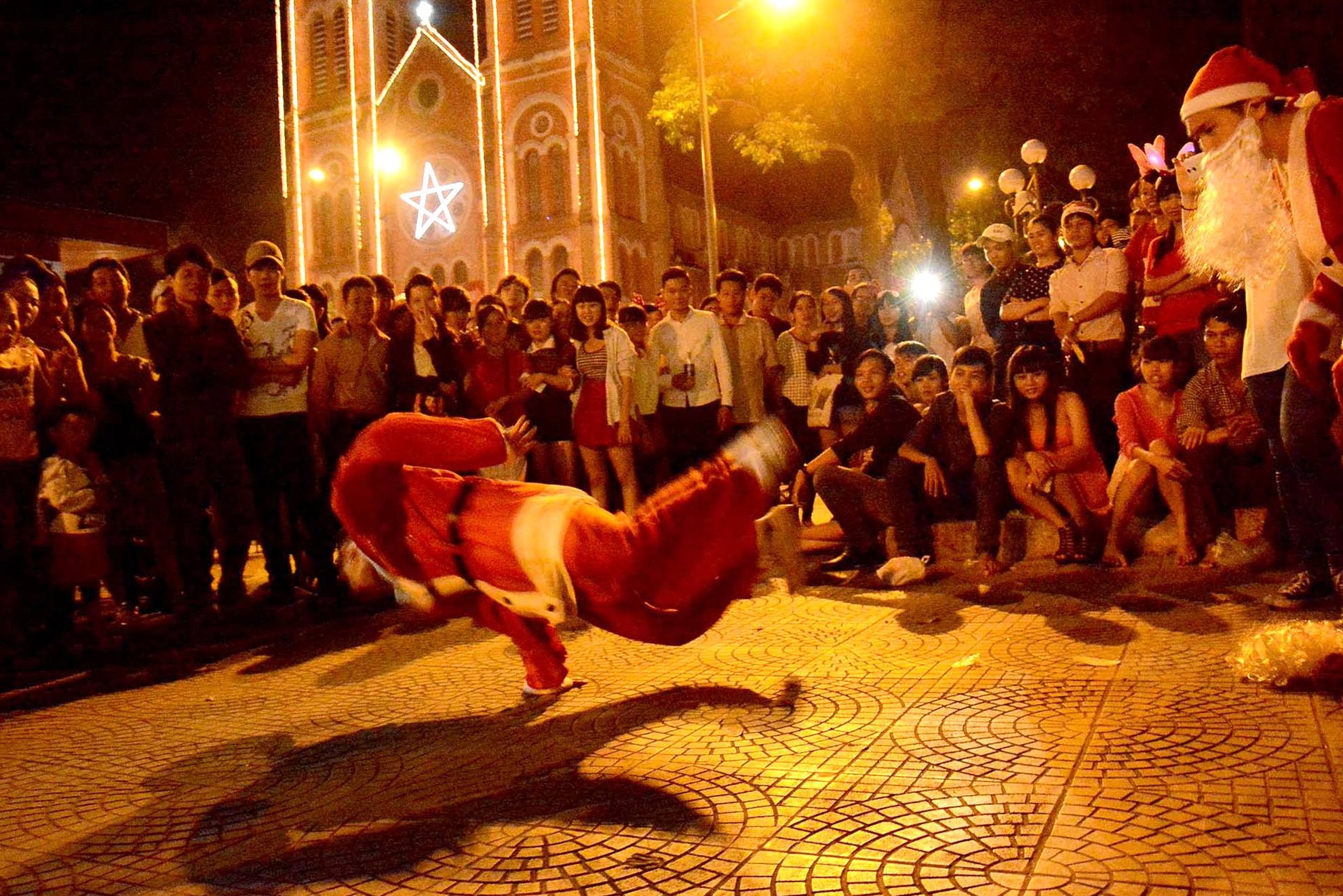| Nhóm âm nhạc đường phố Bigsouth cũng góp vui vào 'lễ hội đường phố' khi thực hiện các động tác nhảy uyển chuyển, thu hút được sự theo dõi của nhiều người đi chơi noel. Ảnh: Minh Thanh. |