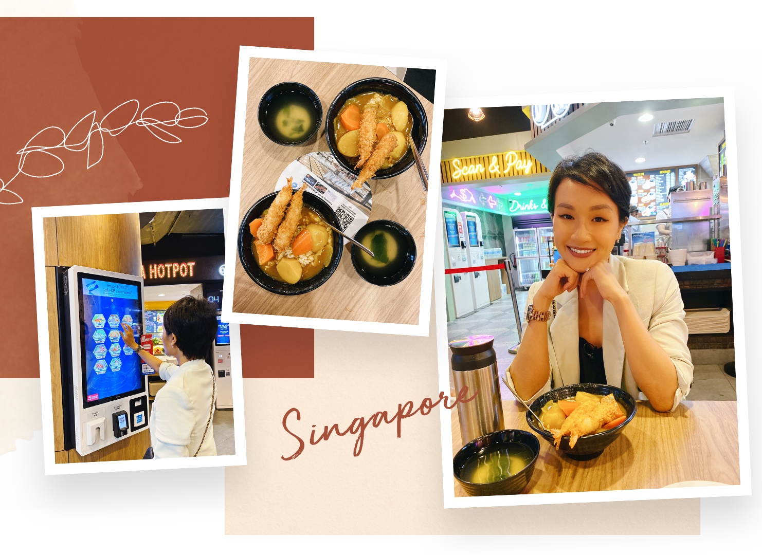| Không chỉ dừng lại ở việc mua quà hay sản phẩm mang về, ẩn thực tại KopiTech cũng khiến các bạn trẻ không khỏi trầm trồ khi đến TTTM này. KopiTech là mô hình quầy ăn ứng dụng công nghệ, giúp khách hàng thuận tiện hơn khi chọn món và thanh toán. Thực khách có thể gọi món thông qua các kiosk tự phục vụ. Các kiosk sẽ hiển thị thực đơn của các quầy bán xung quanh. Như vậy, thực khách không cần xếp hàng, chỉ phải để ý xem số thứ tự của mình trên các bảng điện tử để biết khi nào có đồ ăn. Nhờ mô hình này, Giang chia sẻ cô chỉ mất một khoảng thời gian ngắn để có ngay bữa trưa ngon lành là món cà ri tôm với giá chỉ 5,9 SGD/phần (khoảng 100.000 đồng/phần). |