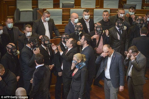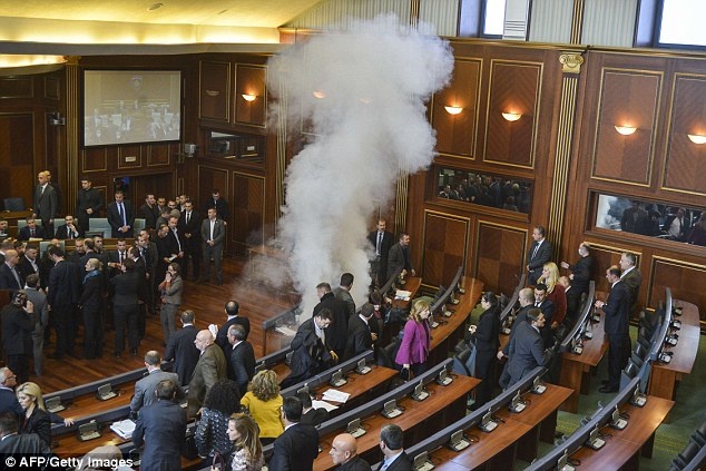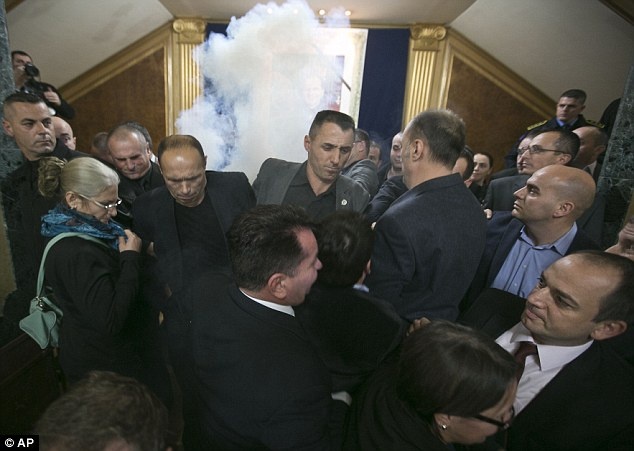 | Lực lượng an ninh kiểm soát toà nhà quốc hội. Theo Daily Mail, ông Glauk Konjufca, một nghị sĩ thuộc đảng Phong trào Tự quyết, không cho phép các phiên họp diễn ra trừ khi chính phủ từ bỏ thỏa thuận với Serbia và Montenegro. Ảnh: AP |