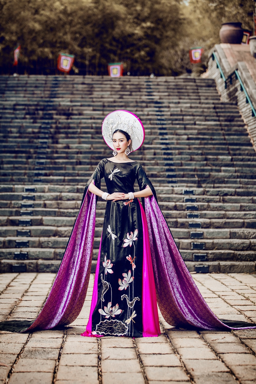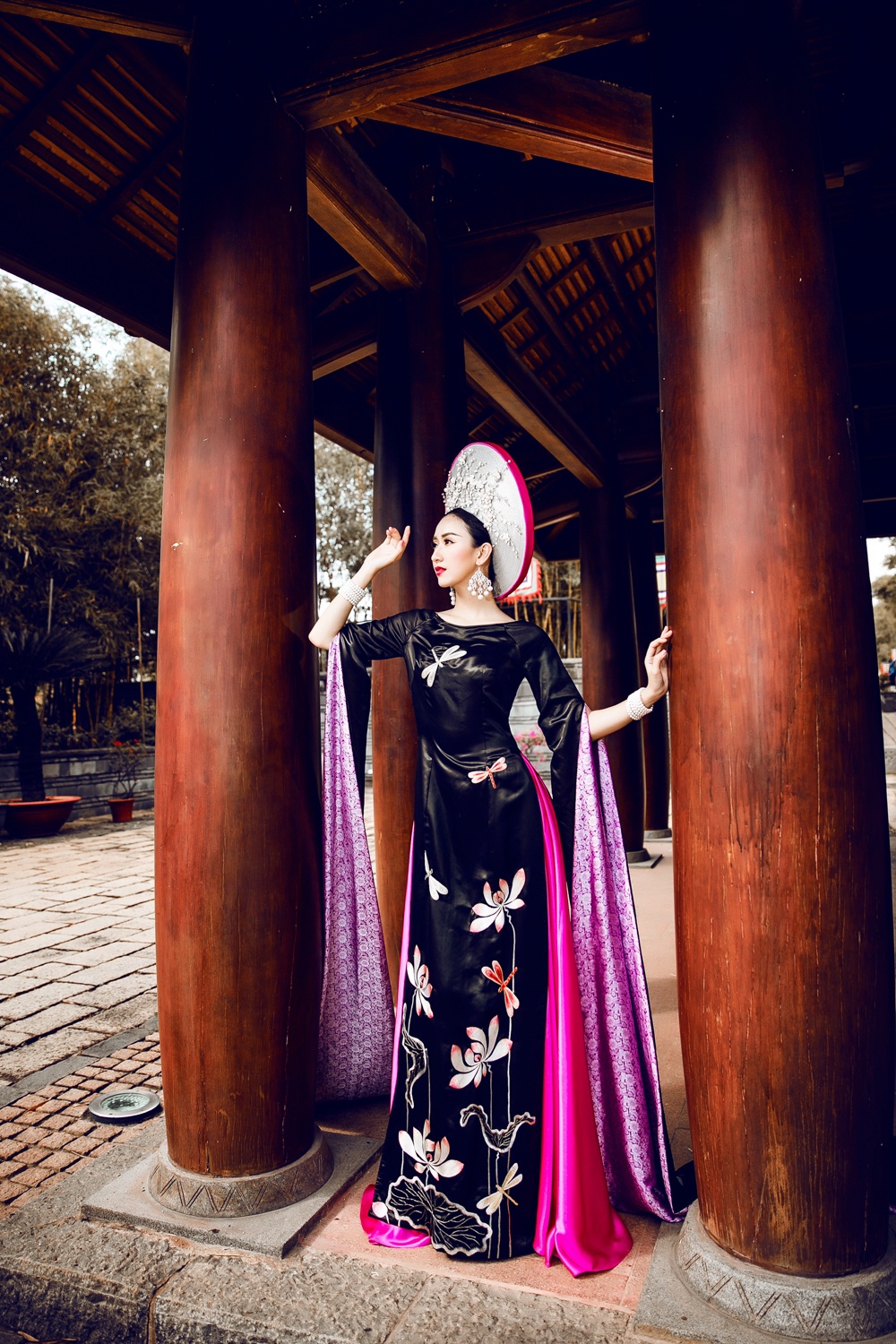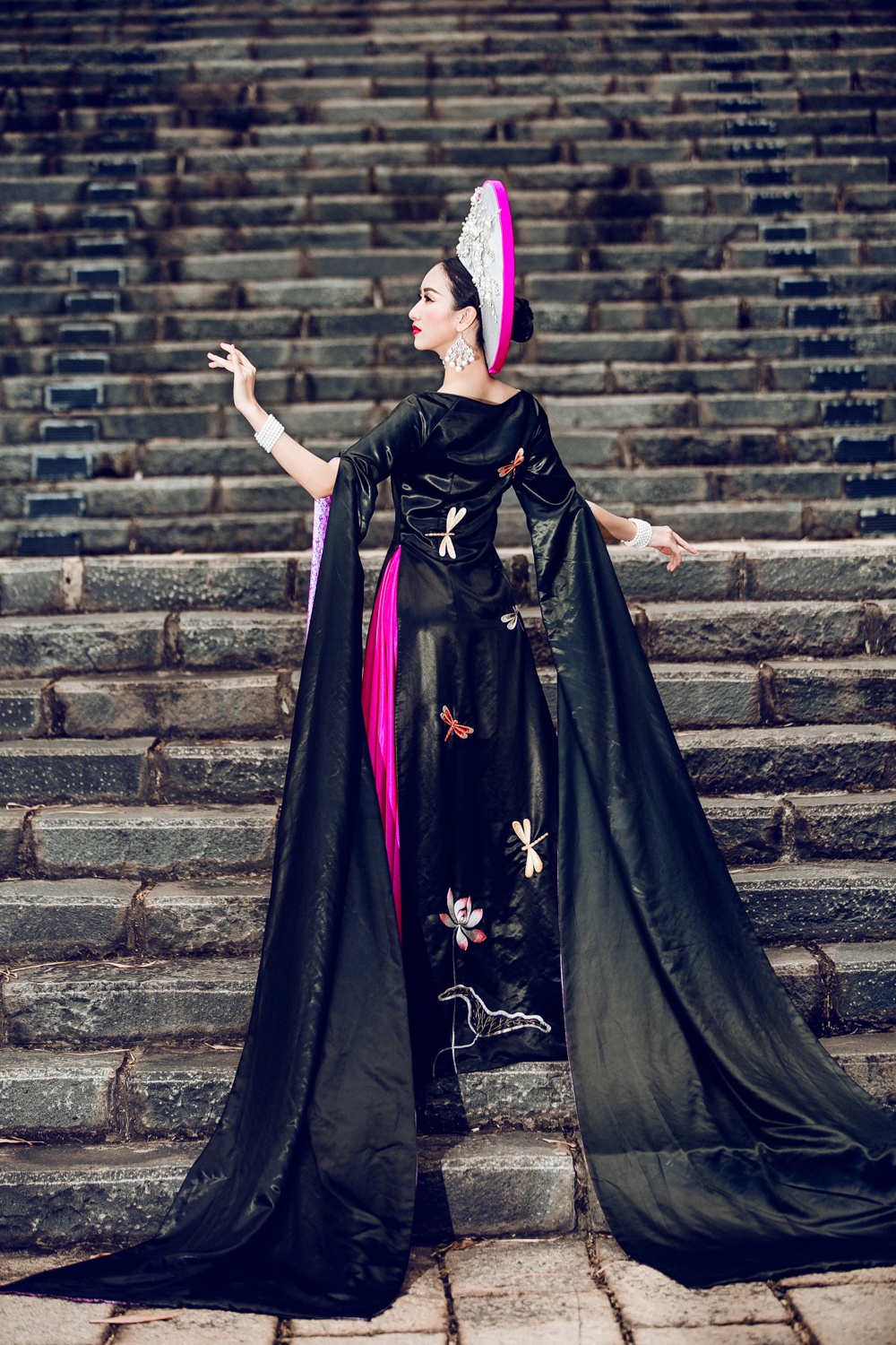 | Thiết kế được cách tân khá sáng tạo với phần cổ áo đơn giản, cánh tay dài phối vải lụa mới mẻ. Họa tiết hoa sen được cách điệu đơn giản nhưng nổi bật trên nền màu đen của vải Lãnh Mỹ A, một trong những chất liệu gắn liền với tên tuổi Võ Việt Chung. |