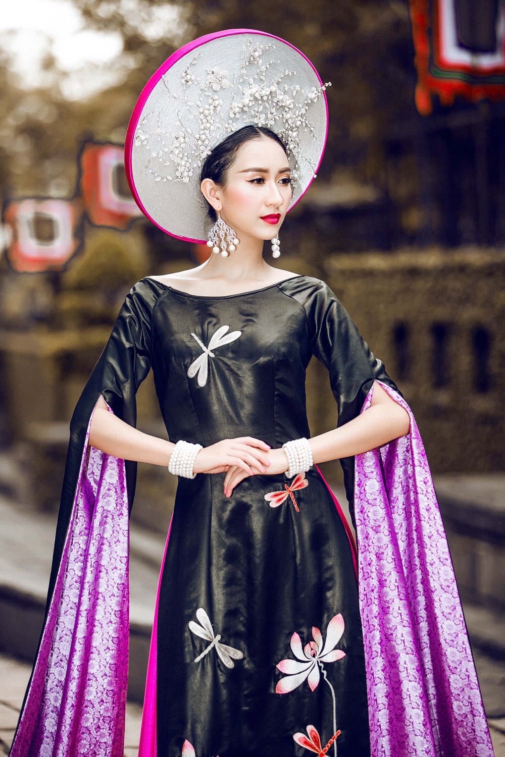 | Ngoài họa tiết hoa sen thời Lý - Trần, tà áo còn có những cánh chuồn chuồn bay lượn khá sống động. |