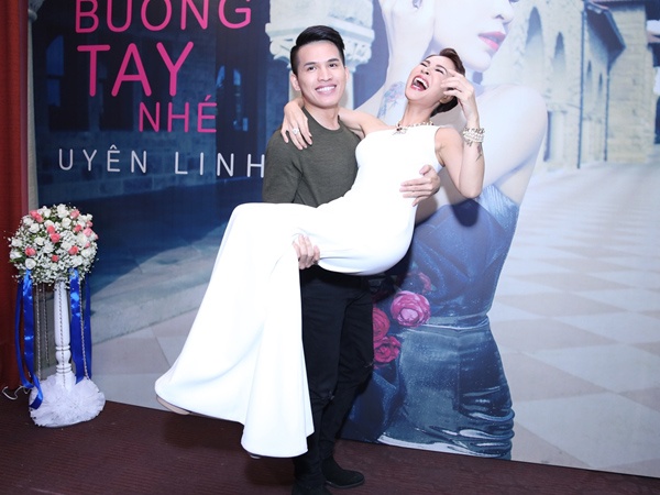 | Quốc Thiên thân thiết với Uyên Linh trong họp báo của nữ ca sĩ. |
