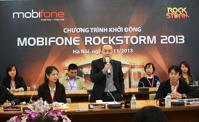 | Nhạc sĩ Quốc Trung chia sẻ với giới truyền thông những dự định mới của mình trong lễ khởi động chương trình Mobifone Rock Storm 2013. |