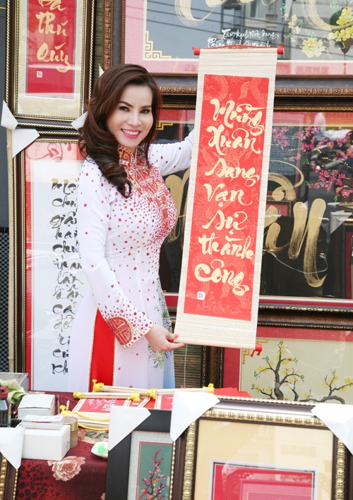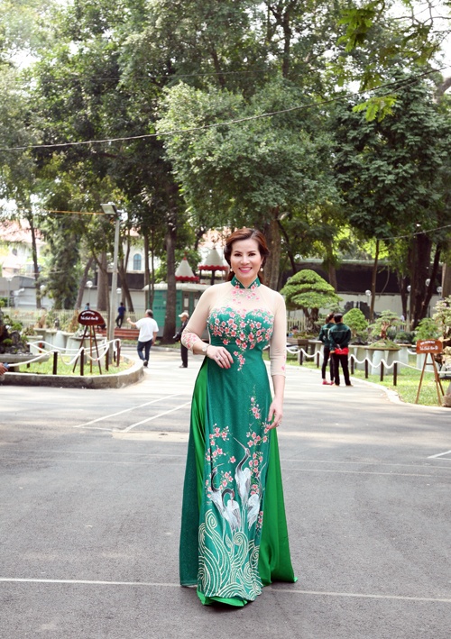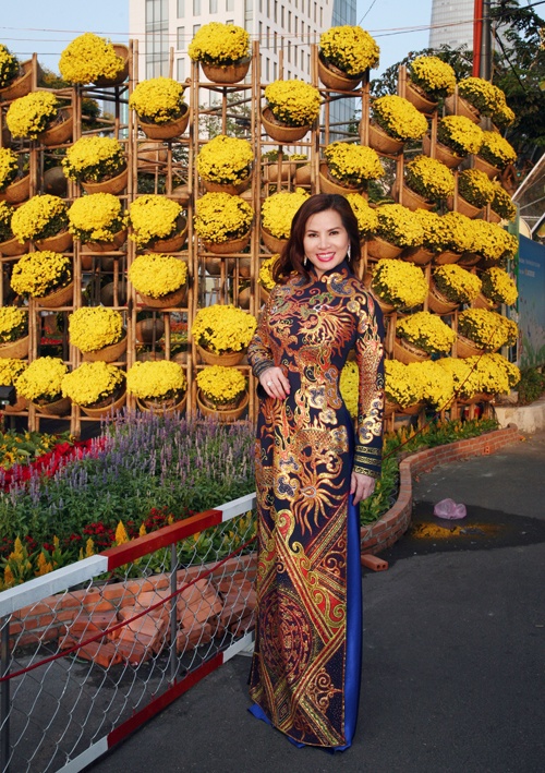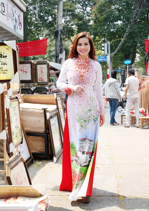 | Trong bộ ảnh mới, chủ đề mùa xuân 2015, Đệ nhất Hoa hậu Quý bà Thế giới chọn những bộ áo dài khi tản bộ trên những con phố đậm hương vị Tết. |