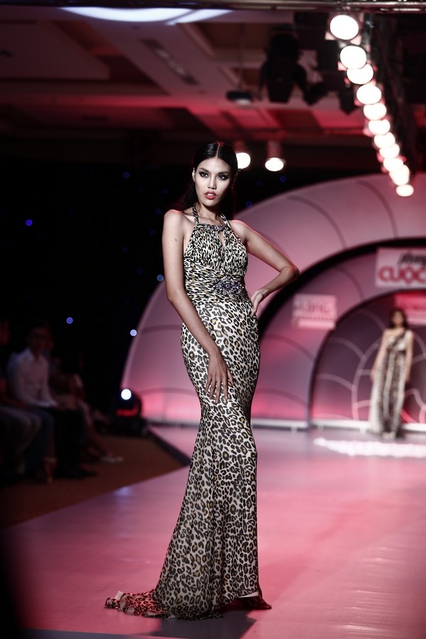 Lan Khuê trong một thiết kế dạ hội họa tiết da báo sang trọng.