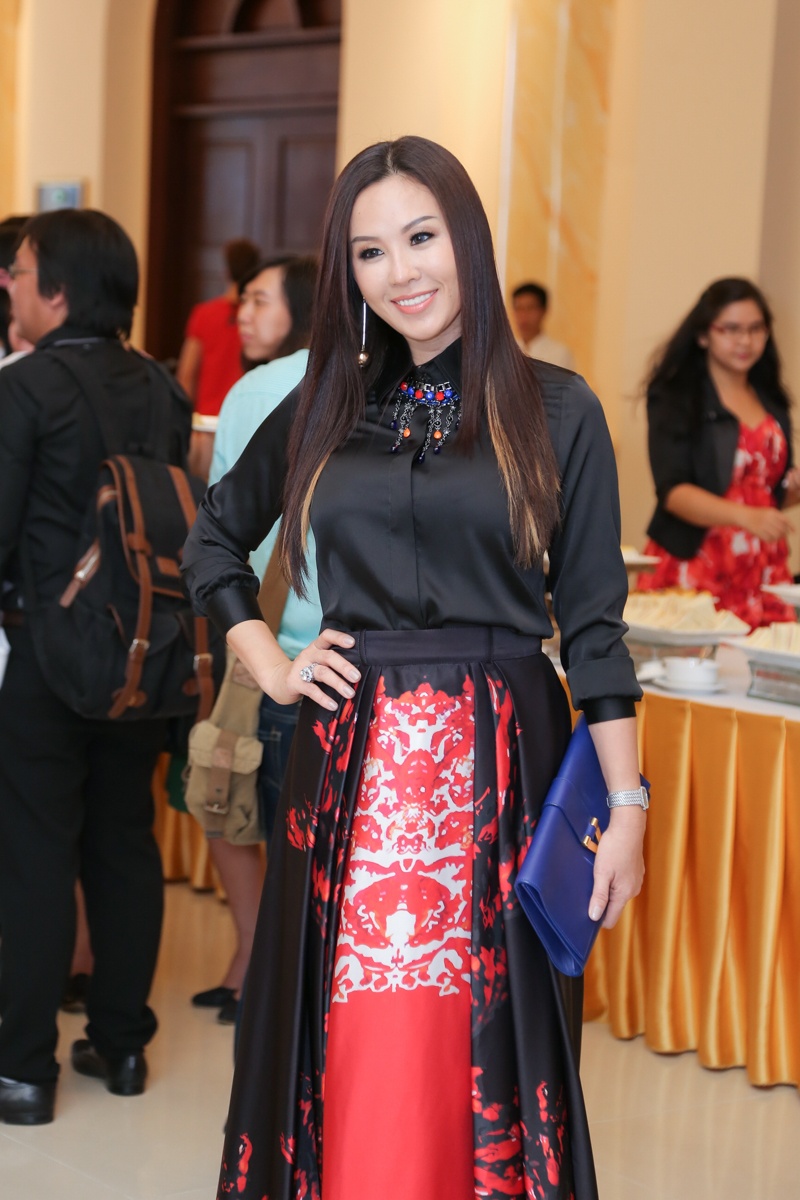 Chiều 29/7, tại buổi ra mắt liveshow của danh ca Ý Lan, hoa hậu Thu Hoài gây chú ý khi diện bộ đầm sang trọng, thanh lịch của thương hiệu Zuhair Murad. Bộ cánh kết hợp giữa áo sơ-mi tối màu kín đáo và chân váy dài xếp ly cá tính. Trang phục được cho là phù hợp với vẻ đẹp thanh lịch của bà mẹ ba con.