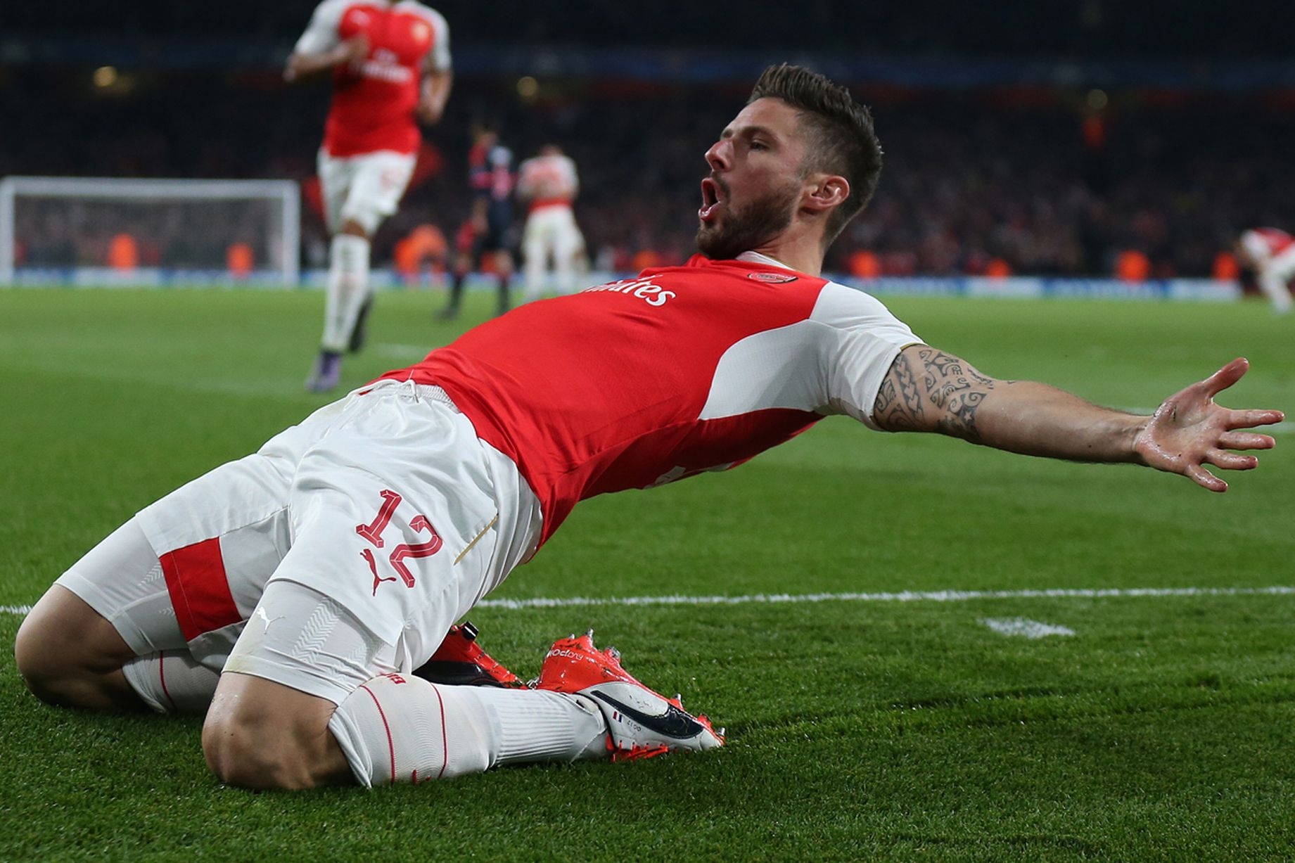 | Oliver Giroud ăn mừng khi ghi bàn mở tỷ số trong chiến thắng 2-0 của Arsenal. |