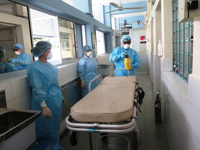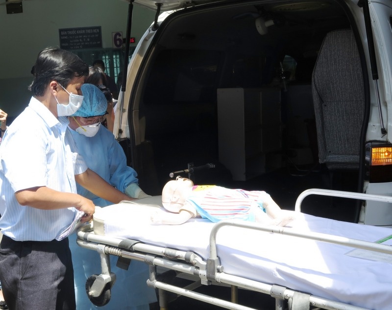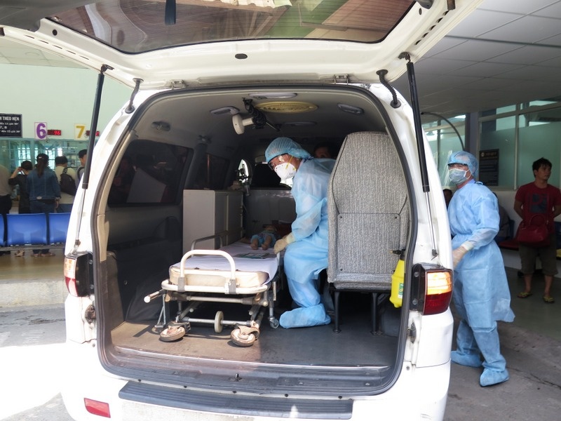 | Nhân viên y tế phun thuốc rửa giường bệnh di chuyển bệnh nhi trong xe cấp cứu. |