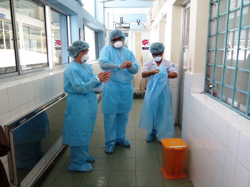 | Các bác sĩ cởi quần áo bảo hộ sau khi tiếp xúc với bệnh nhân để ra ngoài. |