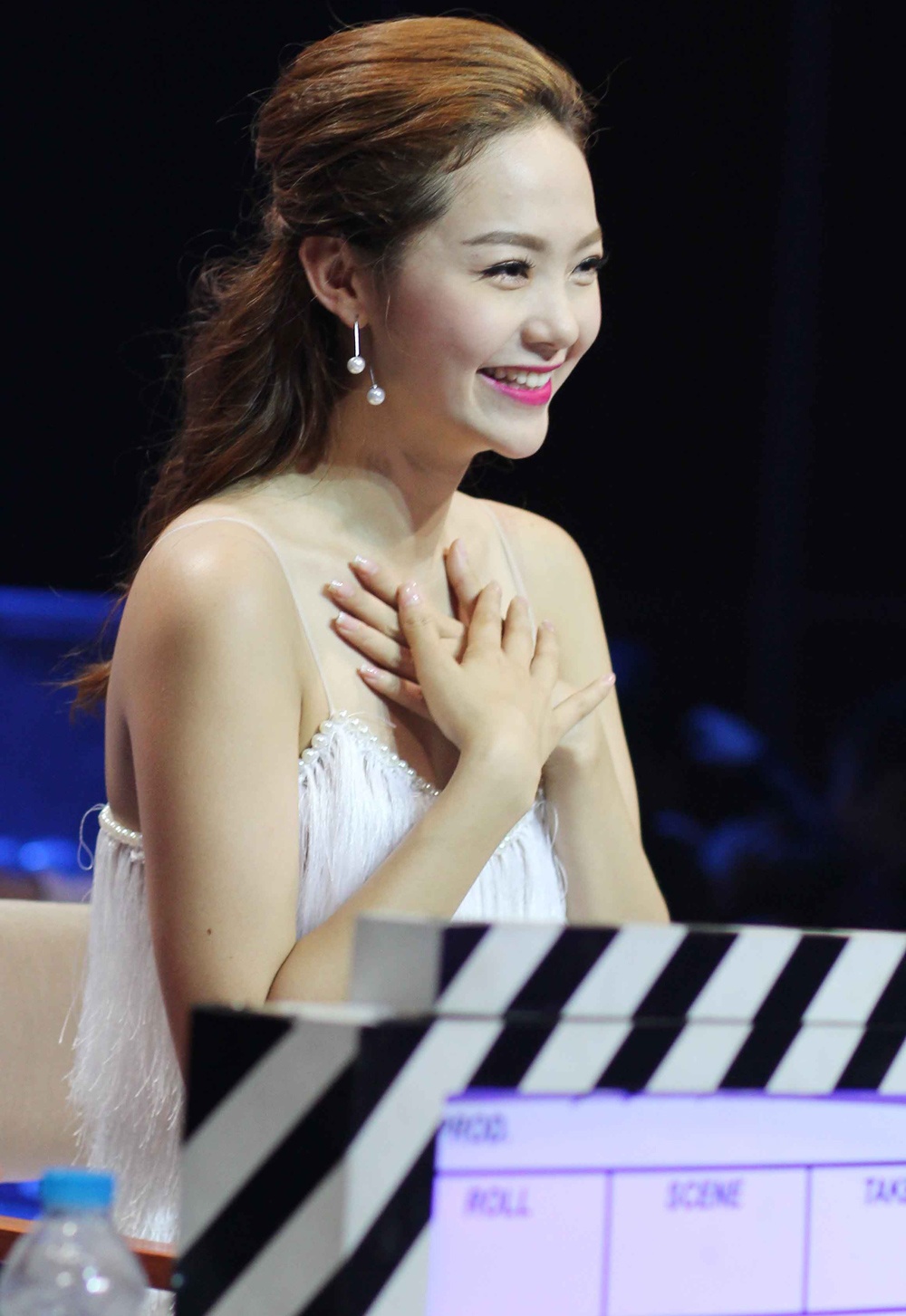 | Nam MC không giấu được cảm xúc: “Tôi không dám nhìn bằng mắt thường mà phải đeo kính râm bởi hôm nay Minh Hằng rất rực rỡ. Ngày thường đã đẹp nhưng hôm nay cô ấy khiến tôi không thể cầm lòng”. |