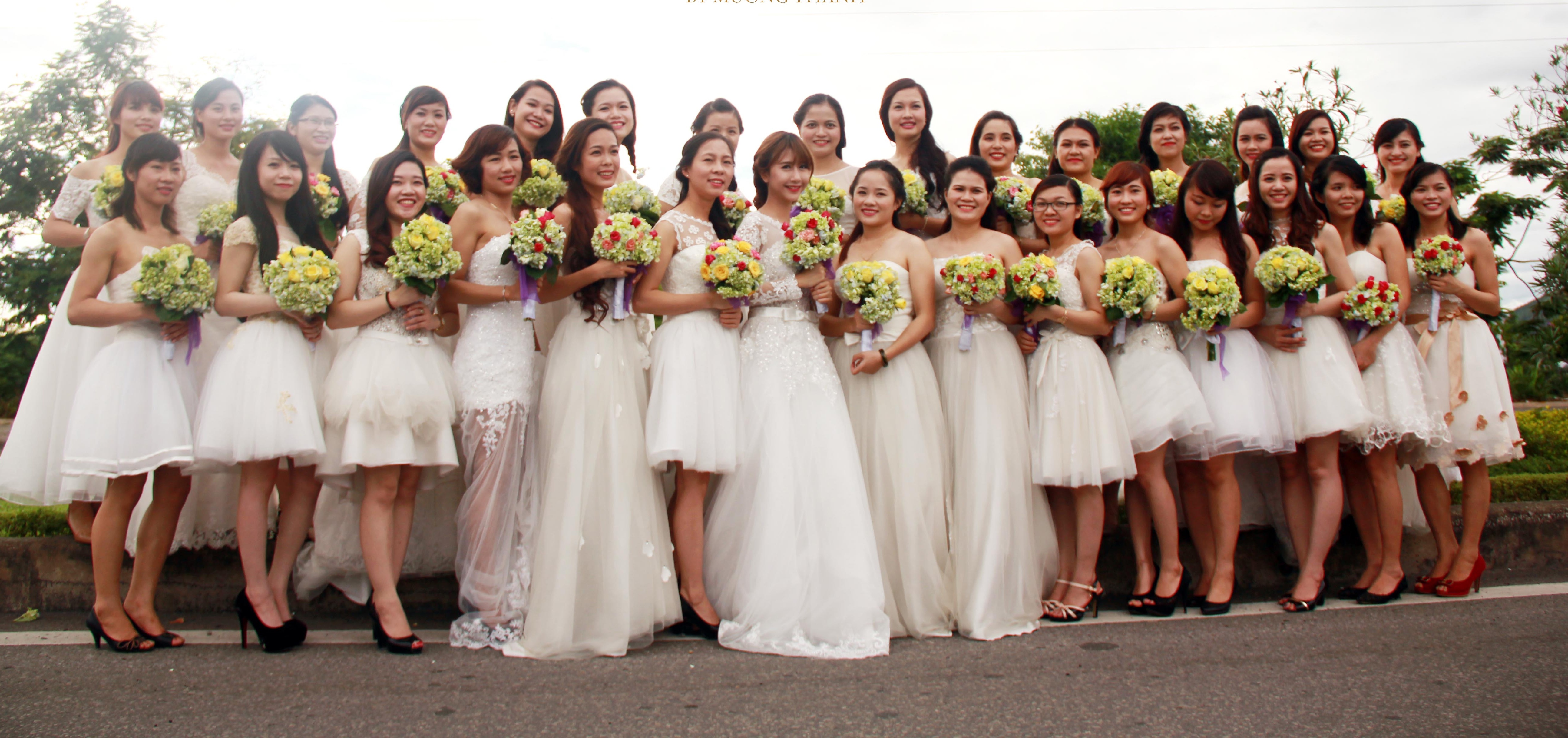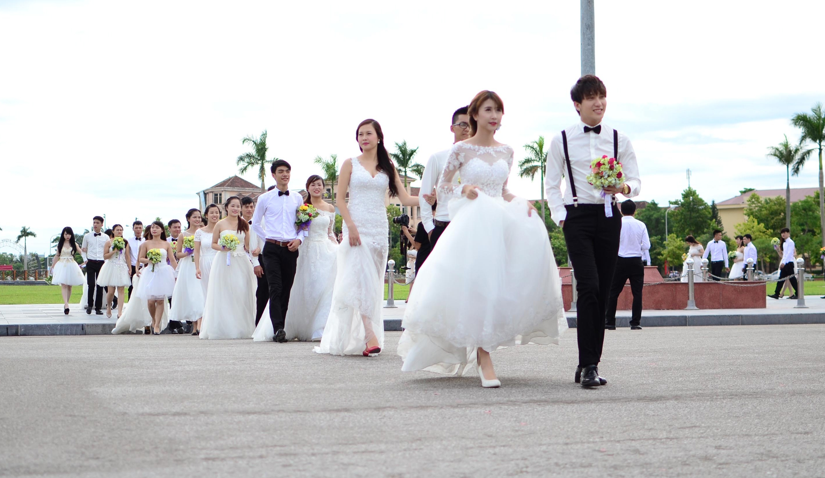 | Hình ảnh 30 cô dâu dịu dàng trong bộ váy cưới trắng tinh cùng 30 chú rể thu hút mọi ánh nhìn của người dân thành phố Vinh. Dẫn đầu là cặp đôi hot trong giới trẻ - Quỳnh Anh Shyn và Bê Trần. |