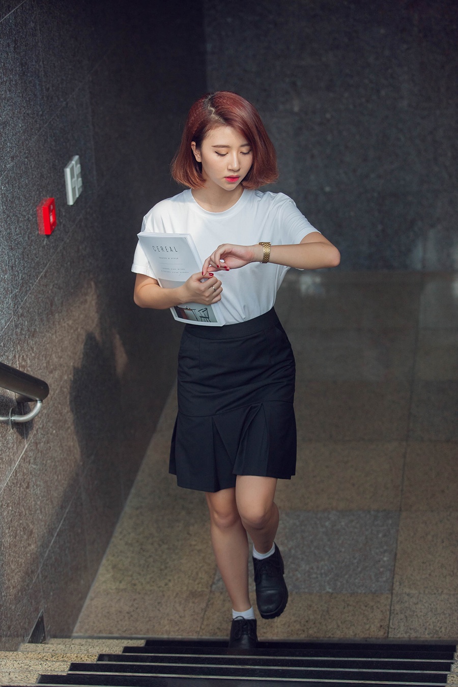 Áo thun trắng mix ăn ý cùng chân váy xòe, giày boots cổ ngắn tiệp tông màu.