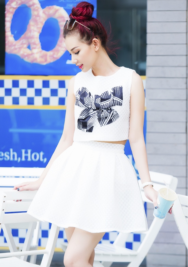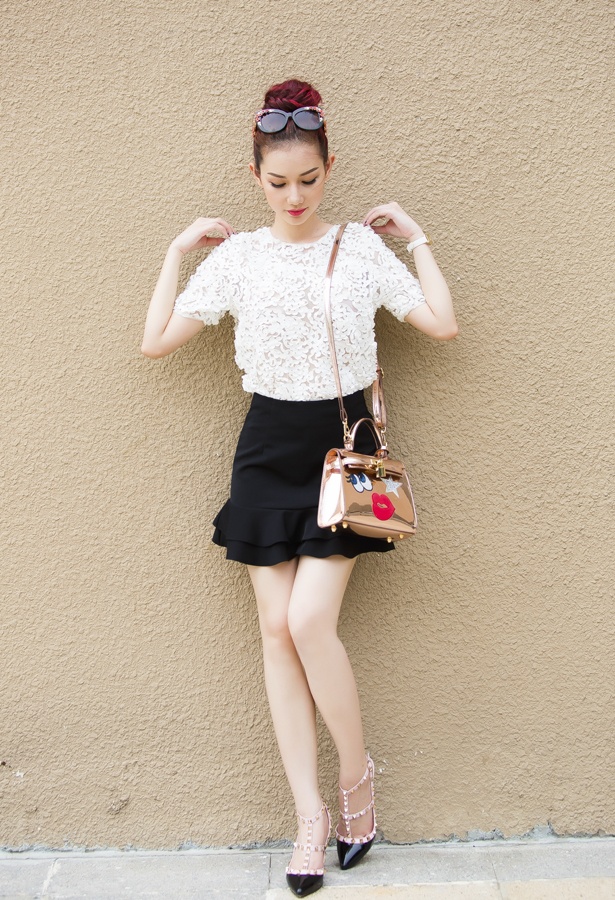 | Ngoài trang phục hiện đại, Quỳnh Chi còn chuộng style thanh lịch, duyên dáng. Người đẹp sinh năm 1990 mix - match tinh tế tông màu đen trắng. Trong ảnh, cô diện áo ren kín đáo cùng chân váy chuông nữ tính. |