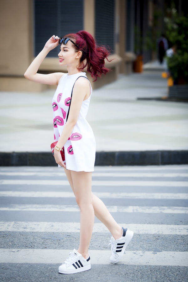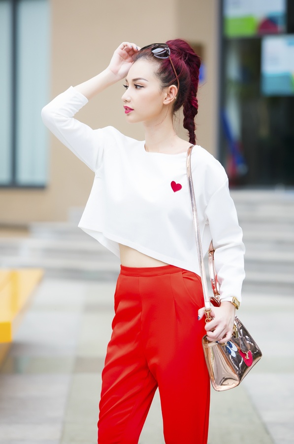 | Mái tóc nhuộm màu đỏ nổi bật với tổng thể nhã nhặn. Tông trang điểm quyến rũ thu hút ánh nhìn khi người đẹp lướt phố. |