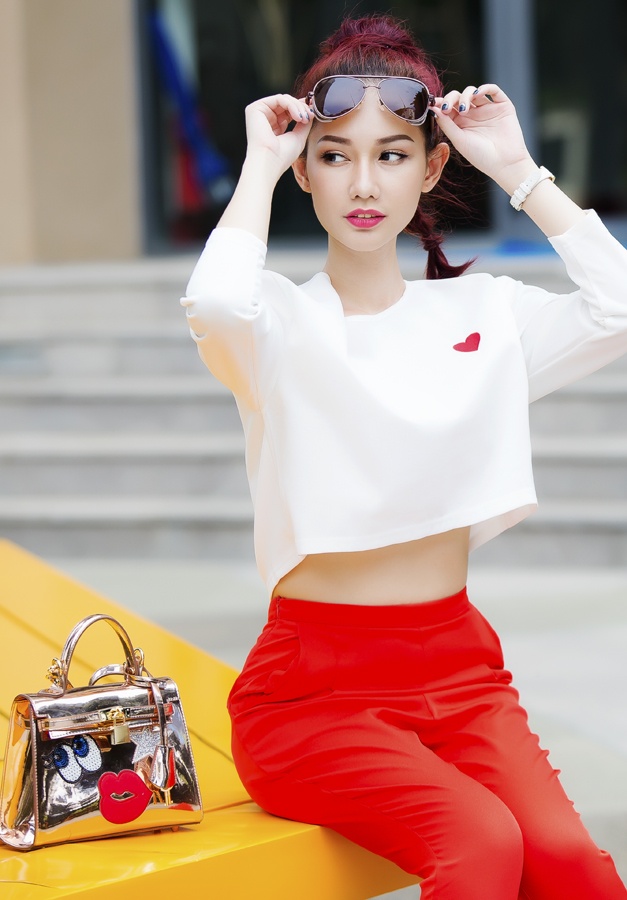 | Bà mẹ 9X làm mới hình ảnh với phong cách năng động, áo thun crop-top mix ăn ý cùng quần âu tông màu nổi. Phụ kiện túi xách ánh kim làm điểm nhấn. |