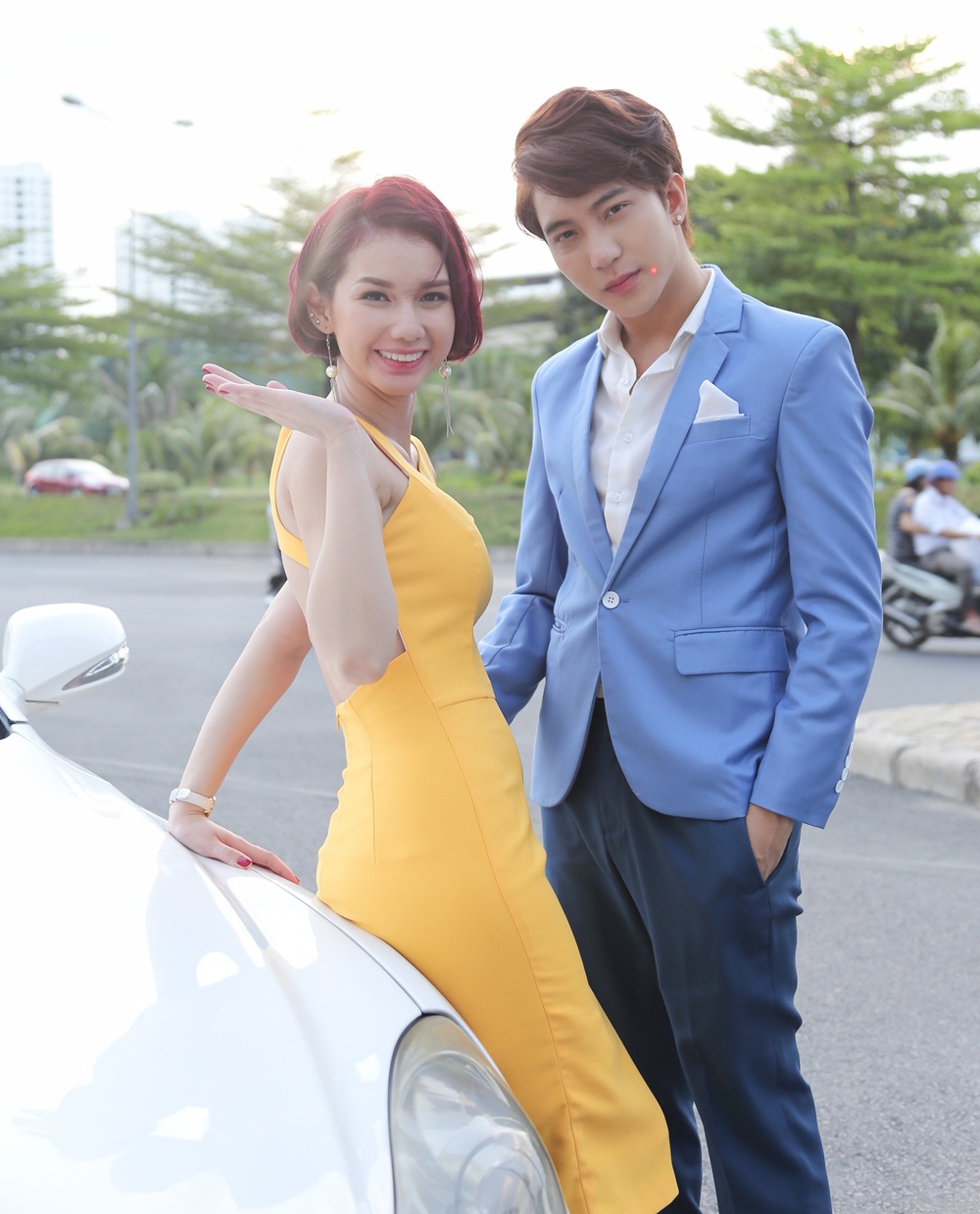 | Quỳnh Chi nhí nhảnh trên trường quay. Bà mẹ một con sắm vai Chi kiêu kỳ, phải lòng nhân vật Huy do Bê Trần đảm nhận. |