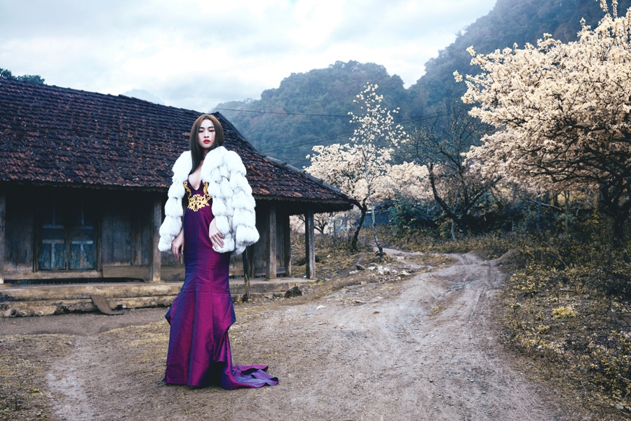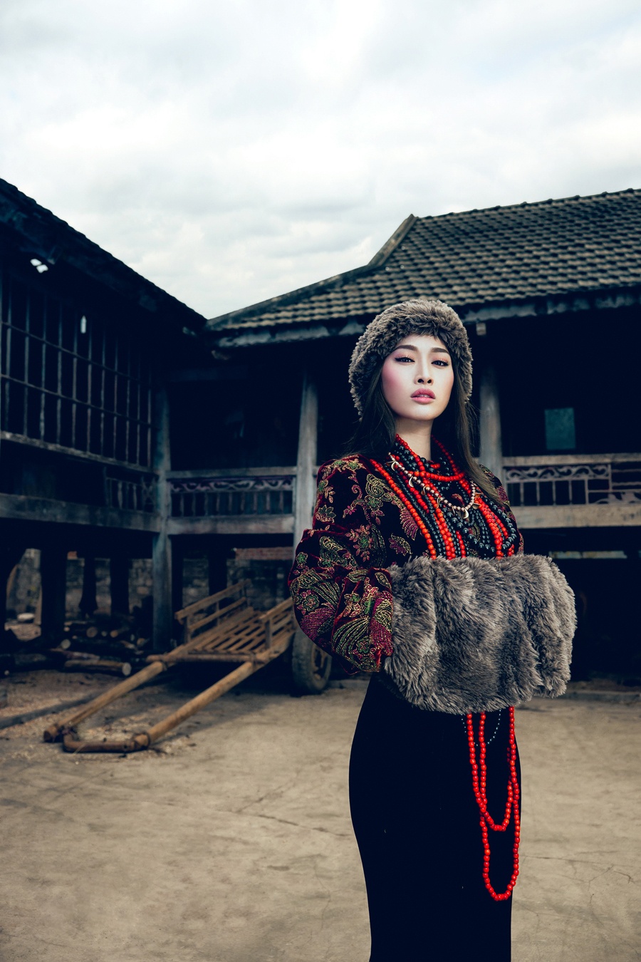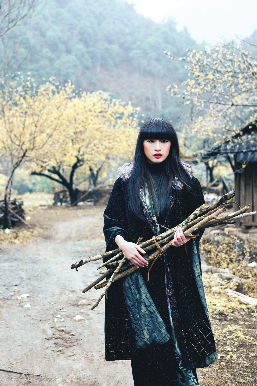 | Trong khung cảnh mơ màng của ngôi làng hẻo lánh ở Mộc Châu, chân dài nổi bật với vẻ kiêu sa, quyến rũ. Trang phục mùa đông gam màu tối kín đáo nhưng vẫn làm bật lên vẻ hấp dẫn của Quỳnh Thy. Khuôn mặt xinh đẹp, sắc sảo là điểm nhấn cho những khung ảnh ''high fashion''. |