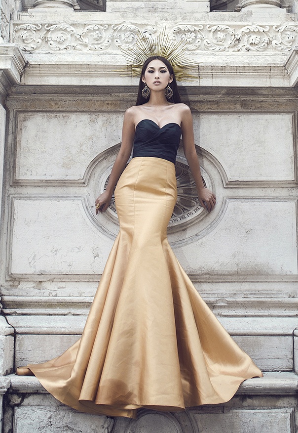| Trong chuyến du lịch kết hợp công việc tại Italy mới đây, Quỳnh Thy đã tranh thủ thực hiện bộ ảnh thời trang trên đường phố cổ kính ở Milan. Nữ người mẫu hóa thân với hình tượng nữ thần quyến rũ. Cô đội vương miện và diện trang phục dạ hội của Lê Thanh Hòa. |