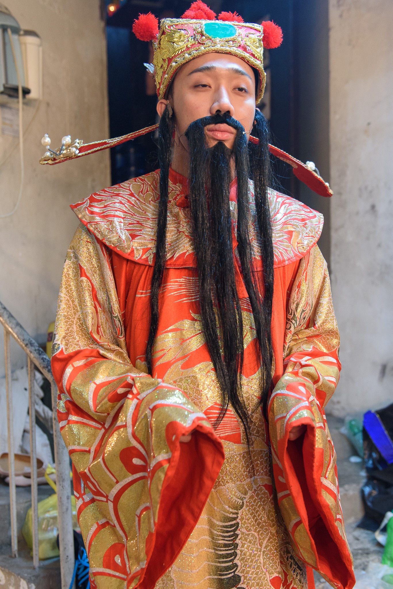 Trong hậu trường, Trấn Thành tập dượt kỹ lưỡng trước khi ra sân khấu. Năm nay, MC điển trai đầu tư nhiều cho sân khấu kịch thay vì tấu hài ở các tụ điểm TP HCM. Trước Tết, anh và các diễn viên ráo riết tập luyện nhằm mang đến vở kịch hấp dẫn cho người xem. |