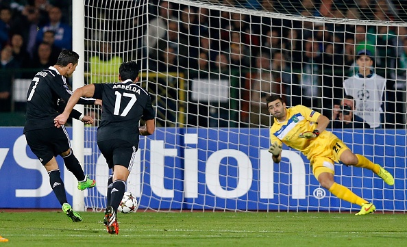 Thế nhưng, CĐV Real cũng không phải đợi lâu để chứng kiến bàn quân bình tỷ số. Phút 24, Ronaldo buộc cầu thủ đối phương phạm lỗi trong vòng cấm và một lần nữa Real lại được hưởng quả đá phạt 11 m. Lần này, siêu sao người Bồ Đào Nha tung ra cú sút quá hiểm nên dù phán đoán đúng hướng bóng song Stoyanov đành bất lực.