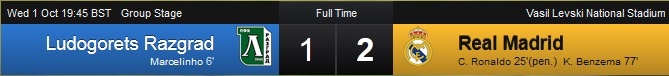 Kết quả này giúp Real tiếp tục thống trị ngôi đầu bảng B với 6 điểm tuyệt đối sau 2 lượt trận. Ở trận đấu cùng giờ, Basel bất ngờ đánh bại Liverpool với tỷ số 1-0 nhờ bàn thắng duy nhất của Marco Streller ở phút 52. Theo đó, vị trí thứ 2 và 3 lần lượt thuộc về Liverpool và Basel khi cùng có 3 điểm. Ludogorets nằm cuối bảng mà chưa được điểm nào.