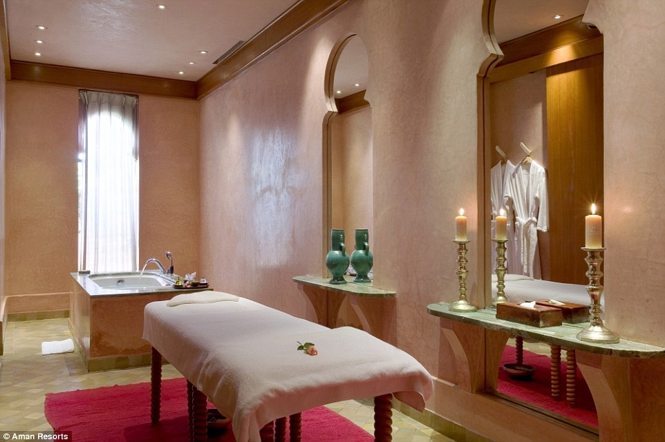 | Khu spa của Amanjena cung cấp mọi dịch vụ từ tắm hơi tới tẩy da chết kiểu Morocco, massage,  bấm huyệt. Phòng tập thể hình có bể bơi nước nóng và các bể bơi riêng. |