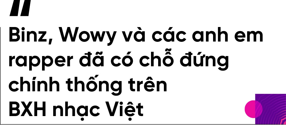 - Binz, Đen Vâu và Wowy. Gần đây nhất, hai bản rap Bigcityboi của Binz và Thiên đàng từ Wowy và JoliPoli chễm chễ ở các thứ hạng cao nhất trên #zingchart và đạt hàng chục triệu lượt nghe trên Zing MP3.