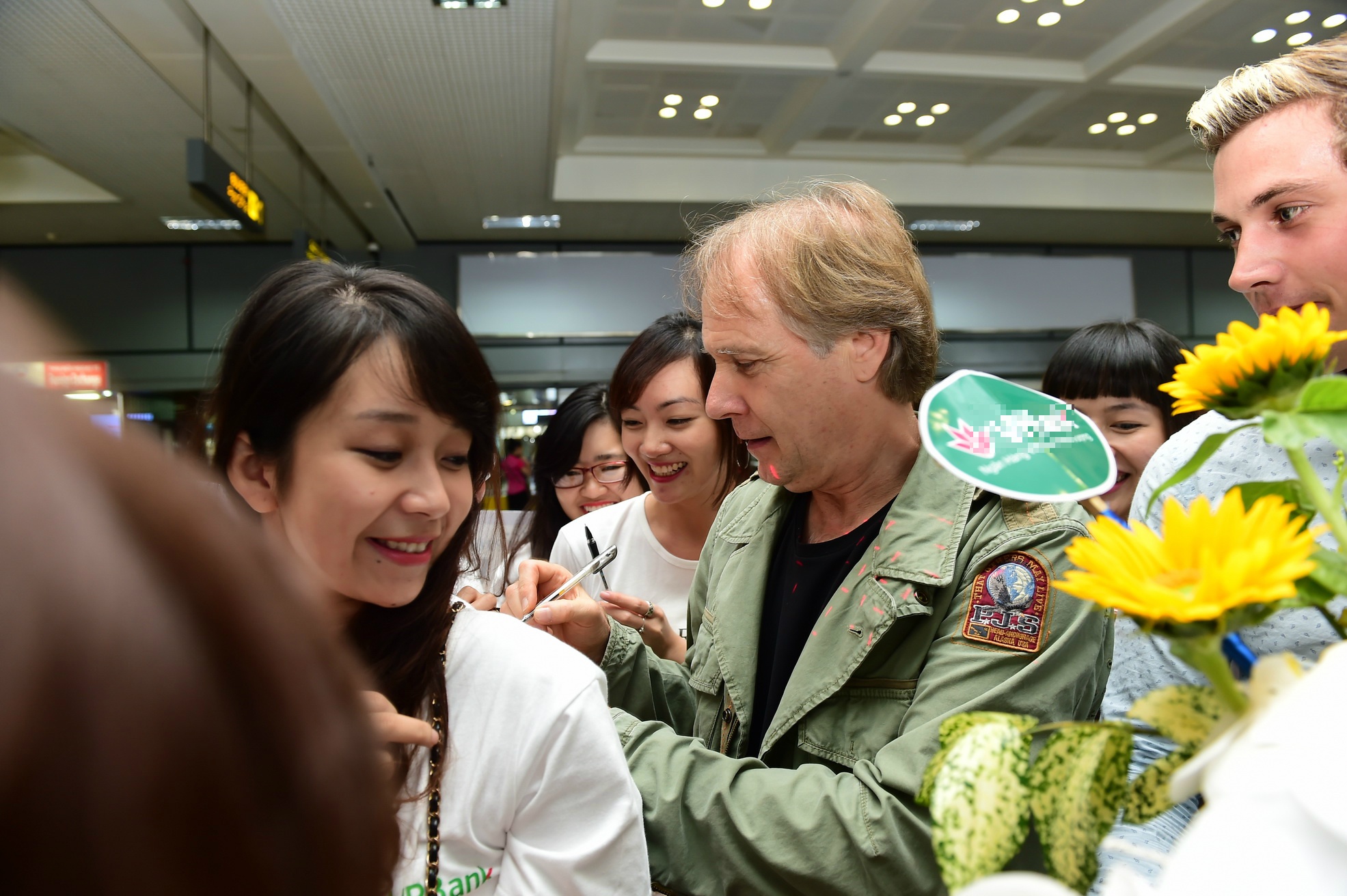 Xuất hiện với phong cách giản dị, Richard Clayderman tỏ ra khá ngạc nhiên trước nhóm người hâm mộ trẻ chào đón mình.