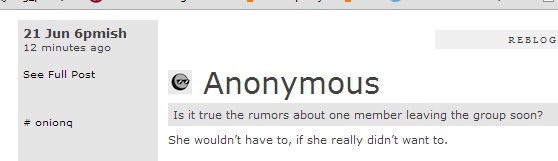 Mới đây, tin đồn một thành viên của “nhóm nhạc nữ quốc dân” có khả năng rời nhóm gây xôn xao cộng đồng Kpop. Tin đồn xuất hiện từ tài khoản oniontaker, một fan nổi tiếng nhờ có nhiều thông tin “mật” từ công ty SM Entertainment, và là cầu nối giữa fan Hàn và fan quốc tế. Sau đó, câu chuyện tiếp tục được một số tài khoản Sones có tiếng khác trên mạng bàn tán. Mặc dù không hề được chứng thực từ phía công ty quản lý, nhưng tin đồn lan nhanh hơn gió.