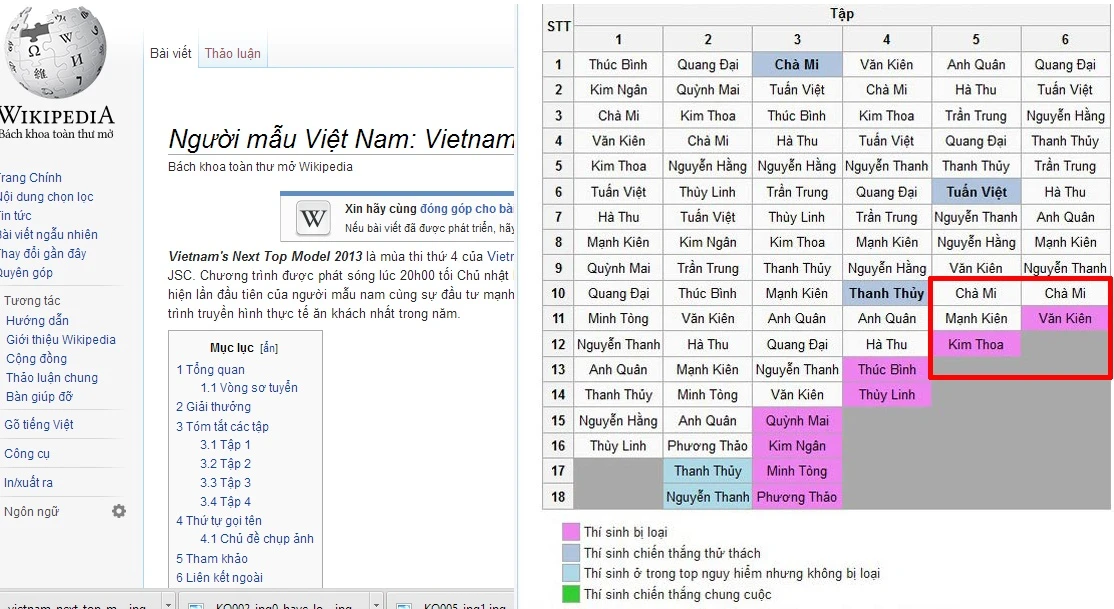 Tập 5 của chương Vietnam’s Next Top Model vừa kết thúc cũng là thời điểm rộ lên thông tin chương trình lộ kết quả tập 6. Một số người hâm mộ theo dõi cuộc thi tỏ ra thất vọng khi kết quả người bị loại ở tập kế đến là Văn Kiên đã được trang thông tin tổng hợp Wiki cập nhật cách đây không lâu.