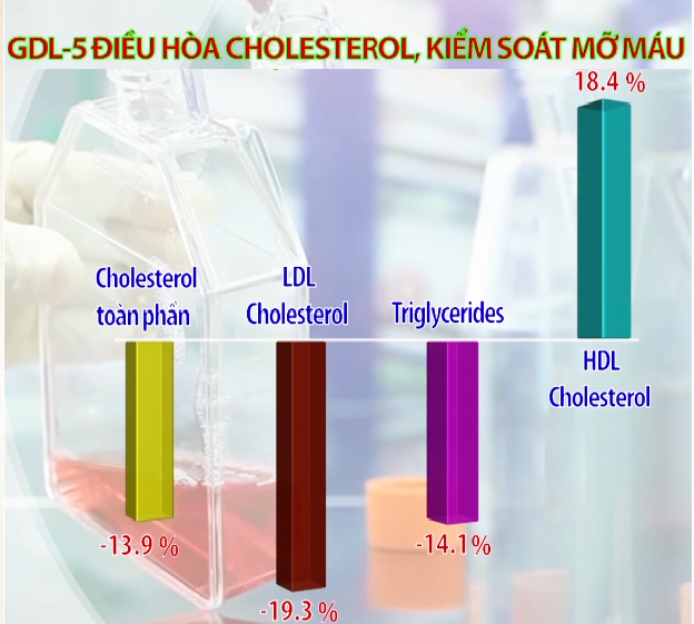 | Nghiên cứu lâm sàng tại Mỹ cho thấy GDL-5 có hiệu quả vượt trội giúp làmn tăng HDL- Cholesterol có lợi và giảm các thành phần bất lợi: cholesterol toàn phần, giảm LDL cholesterol và triglycerides. |