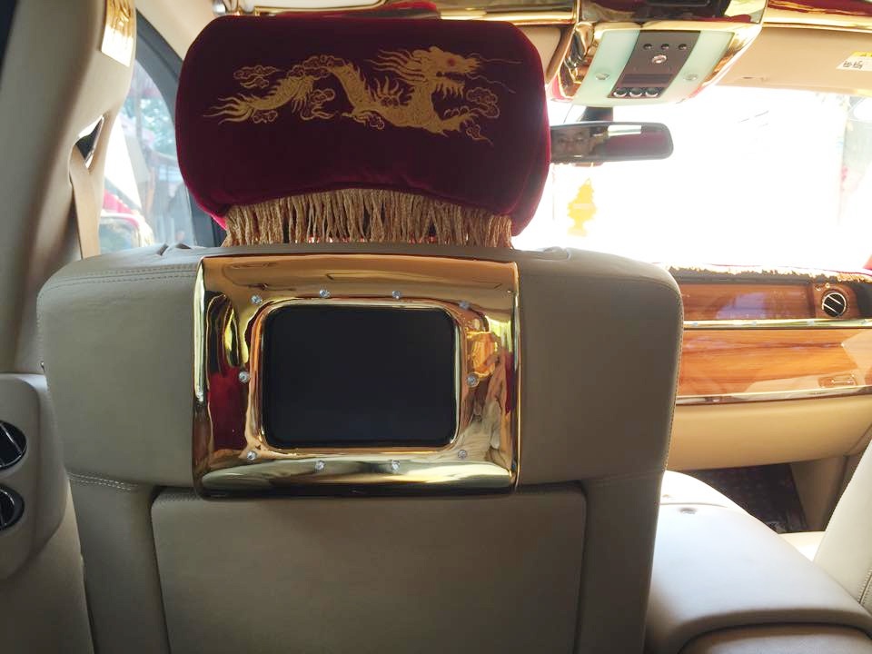| Các tựa đầu bọc nhung, thêu hình rồng. Đường viền màn hình phía sau lưng ghế hay miếng ốp trần cũng được mạ vàng. |